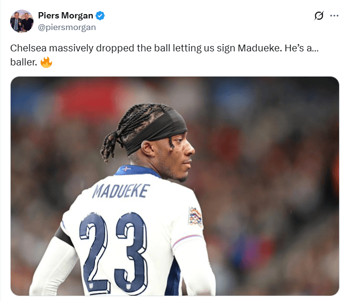 赛后,英国知名记者、阿森纳球迷皮尔斯-摩根更新社交媒体发文赞美马杜埃凯:切尔西真是大意了,让我们签下了马杜埃凯。他真是个超级球员!