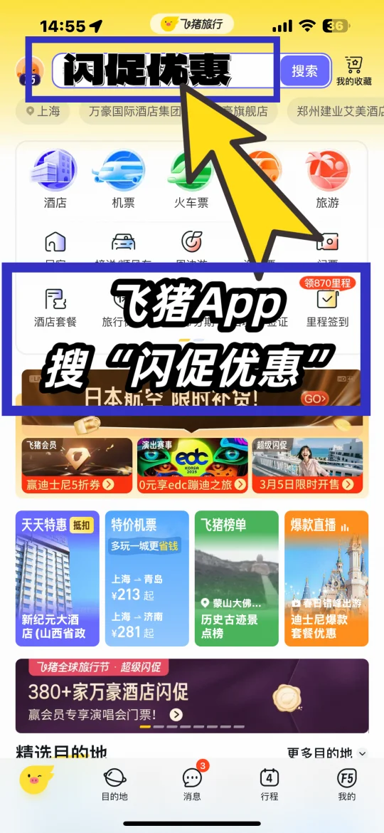 ㊙️划重点:点击左下角直达活动,或者上飞猪搜🔎【闪促优惠】或者直接点左下角按钮可以直达