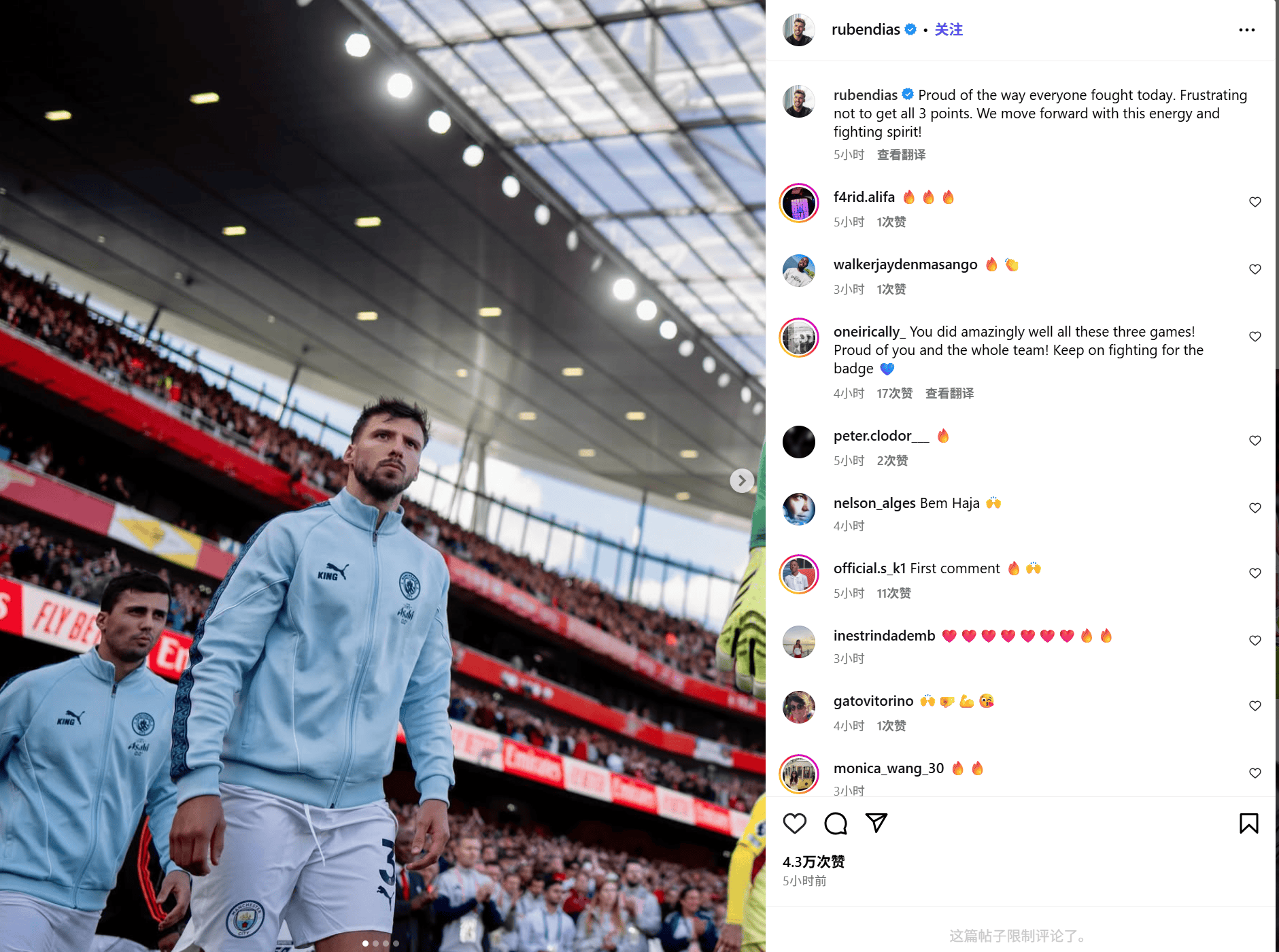 虎扑09月22日讯在此前结束的一场英超比赛中,曼城1-1战平阿森纳。本场比赛结束之后,曼城球员鲁本-迪亚斯也更新了社交媒体,发文谈到了这场比赛。