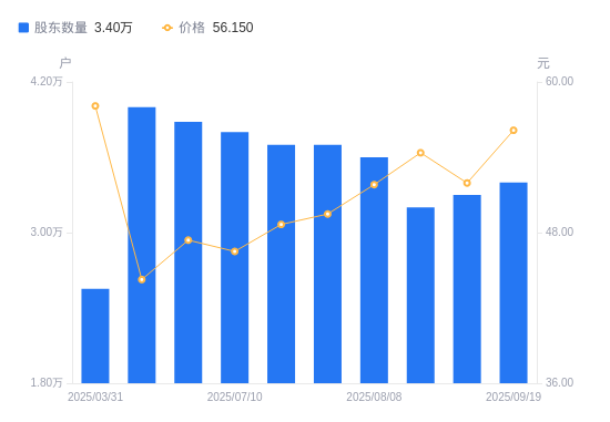 日期A股户数(户)流通A股户均持股数(股)户均持股市值(万元)2025-09-193400014892.5883.622025-09-103300015343.8879.712025-08-293200015823.3786.022025-08-083600014065.2272.892025-07-313700013685.0867.712025-07-203700013685.0866.582025-07-103800013324.9461.962025-06-303882013043.4861.832025-05-304000012658.7056.032025-03-312551219847.44115.29