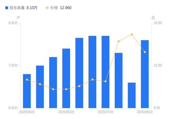 日期A股户数(户)流通A股户均持股数(股)户均持股市值(万元)2025-09-108100036930.9847.862025-08-107100042132.5259.832025-07-317800038351.4052.622025-07-208200036480.6039.732025-07-108200036480.6040.202025-06-308153436689.1038.712025-06-207900037865.9439.122025-05-317700038849.4740.132025-05-197500039885.4642.642025-04-207300040978.2145.12
