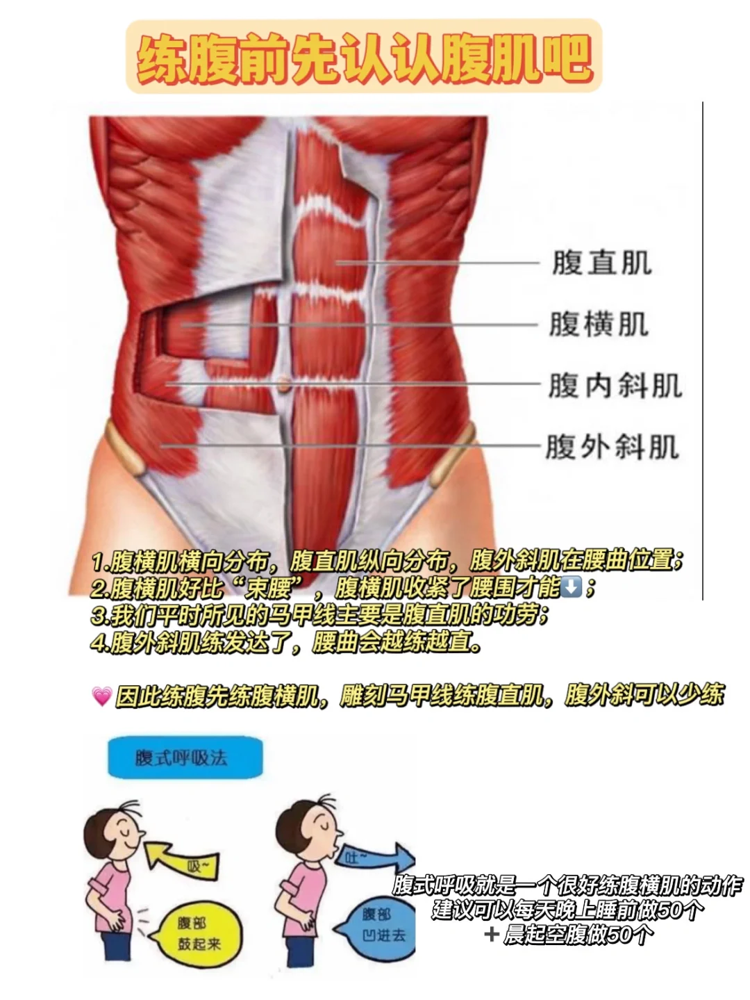 ✅除了通过腹式呼吸训练腹横肌,如果你想要清晰的腹部线条,那么腹直肌+饮食管理也得抓