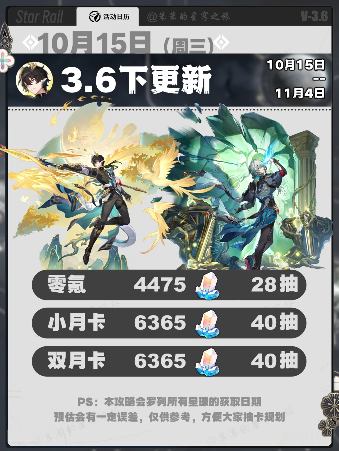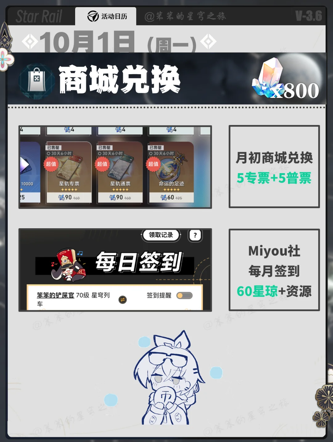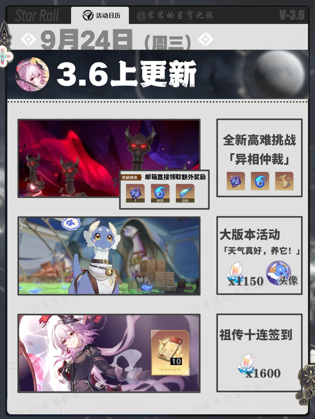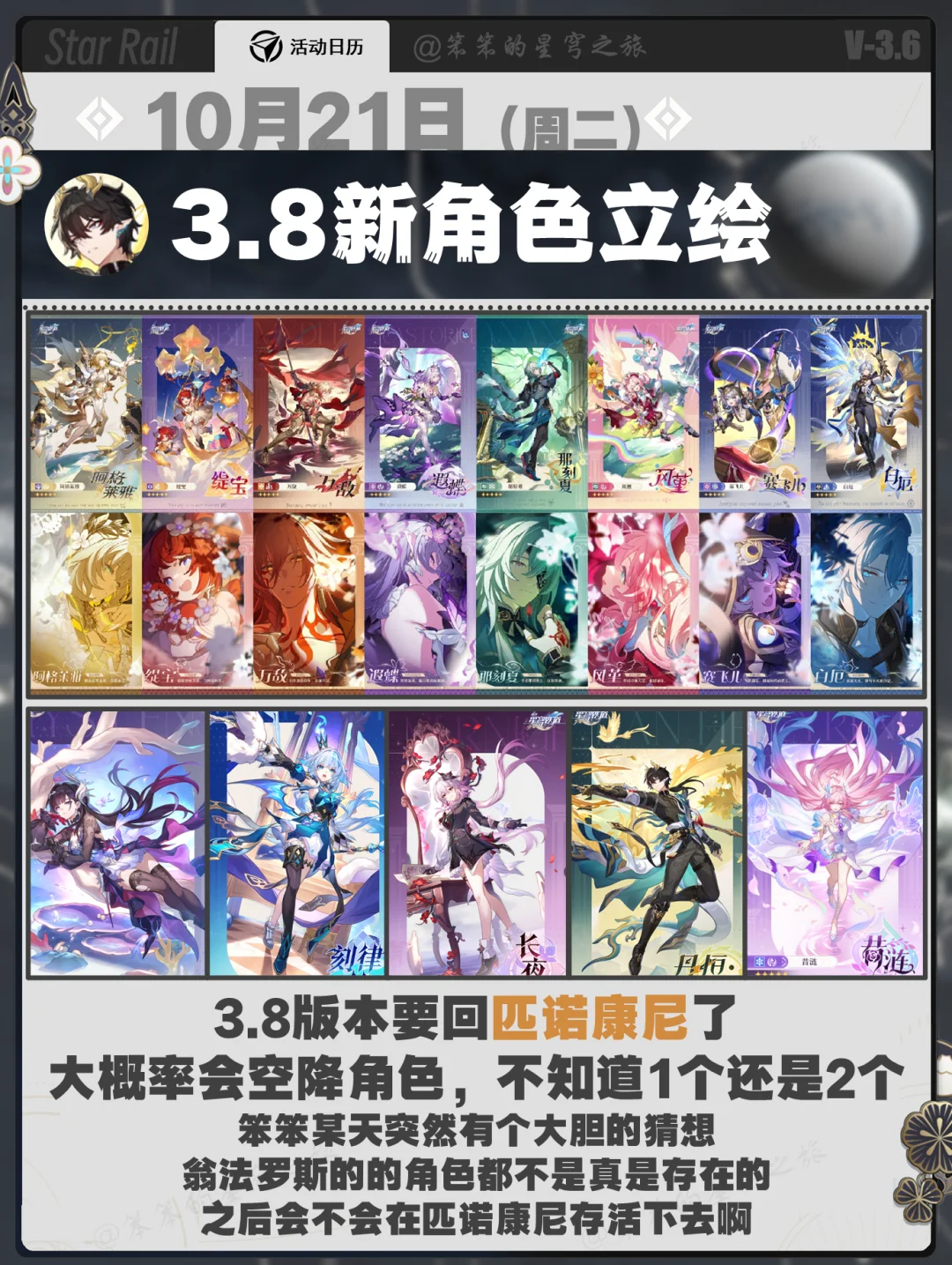 🐱大家好,我是笨笨的铲屎官 今天给大家带来的是崩坏星穹铁道10月活动 重点内容如下: ①3.6版本更新在9月底 ②10月15日 白嫖丹恒SP ③10月21日 3.8角色立绘 ④10月24日 昔涟版本前瞻 10月你比较期待什么内容