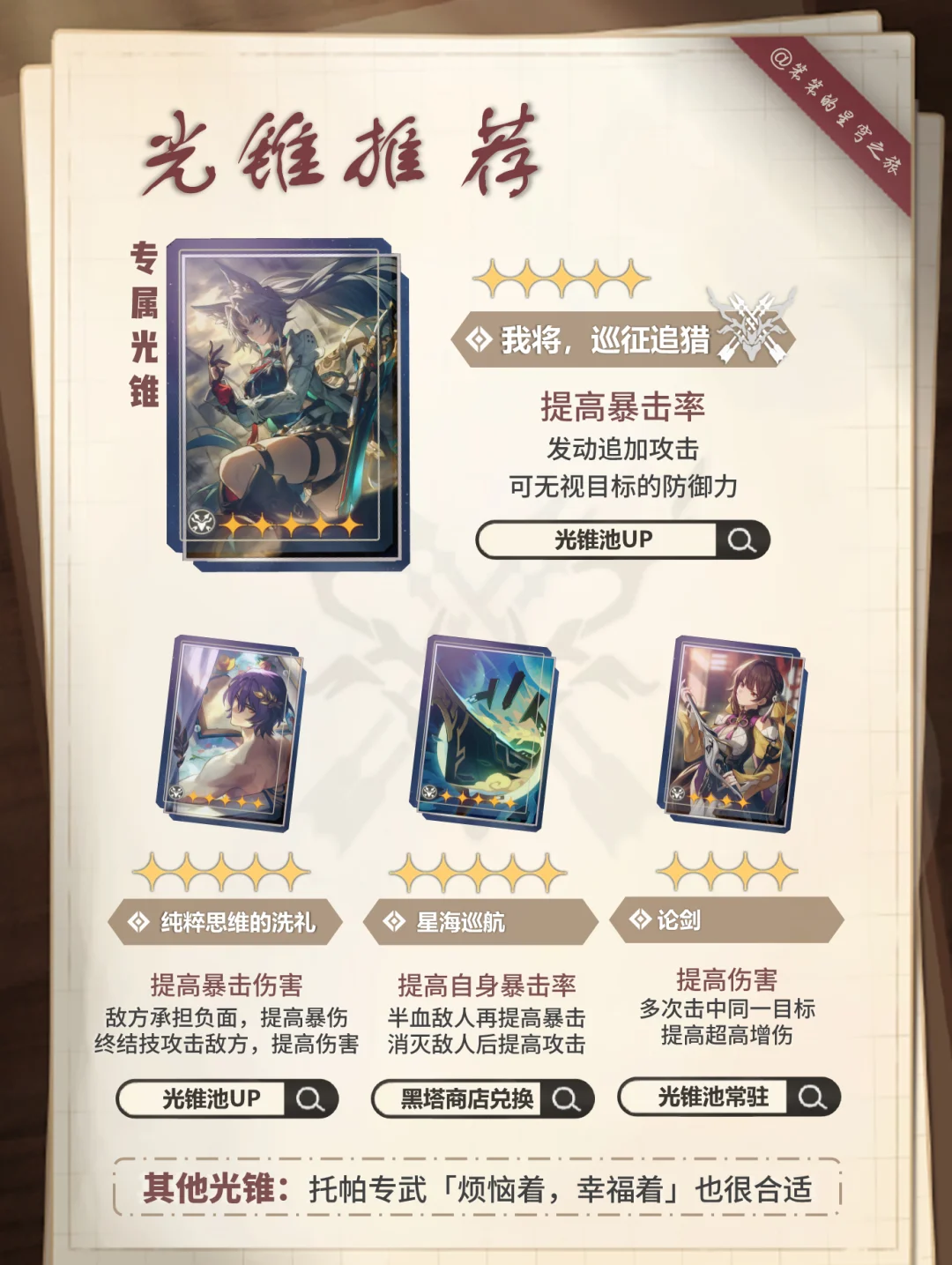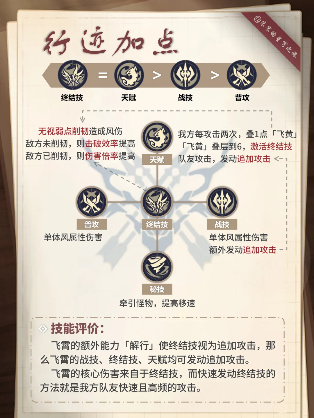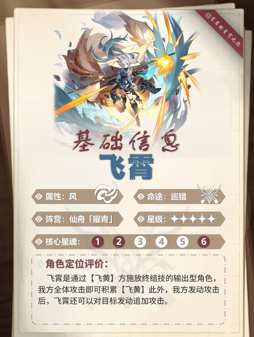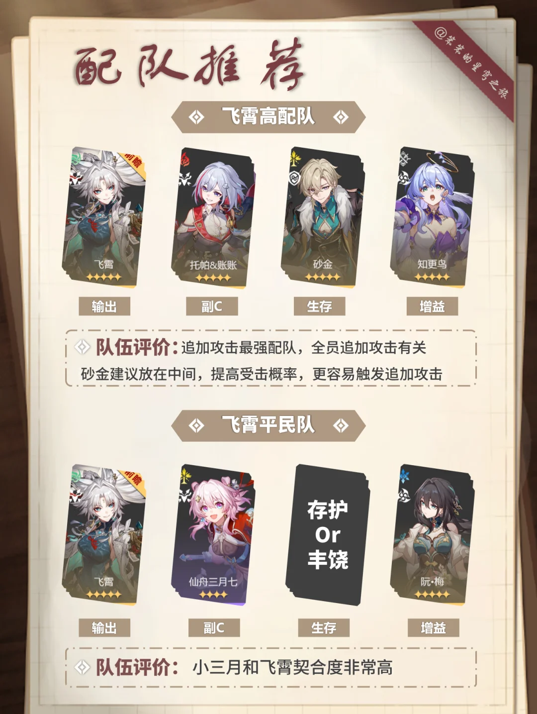🐱大家好,我是笨笨的铲屎官 今天给大家带来的是飞霄的培养攻略 飞霄作为追加攻击+终结技伤害为主的巡猎输出 可以在真托砂鸟队中作为真理的上位 强度上限提高了很多 是目前星铁最强的单体爆发输出角色 如果没有托帕的开拓者 也可以用小三月(巡猎)作为下位替代 知更鸟在追击队中的强度已经不用多说了 没有的开拓者强烈推荐拿下一个