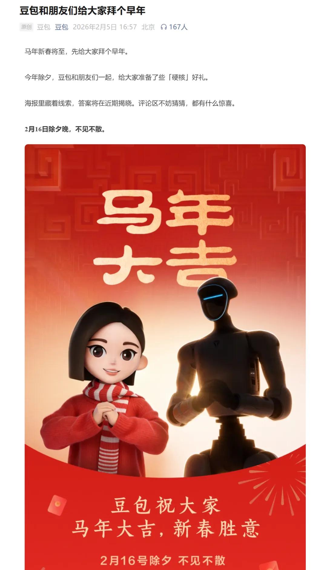 2月5日,豆包开启了提前预热,发文称马年新春将至,先给大家拜个早年。