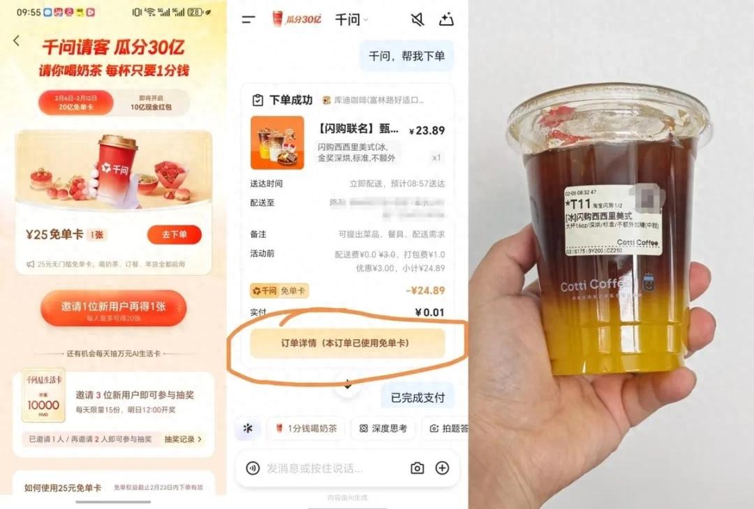 最新的数据显示,活动上线不到3小时,千问APP送出超100万单奶茶。