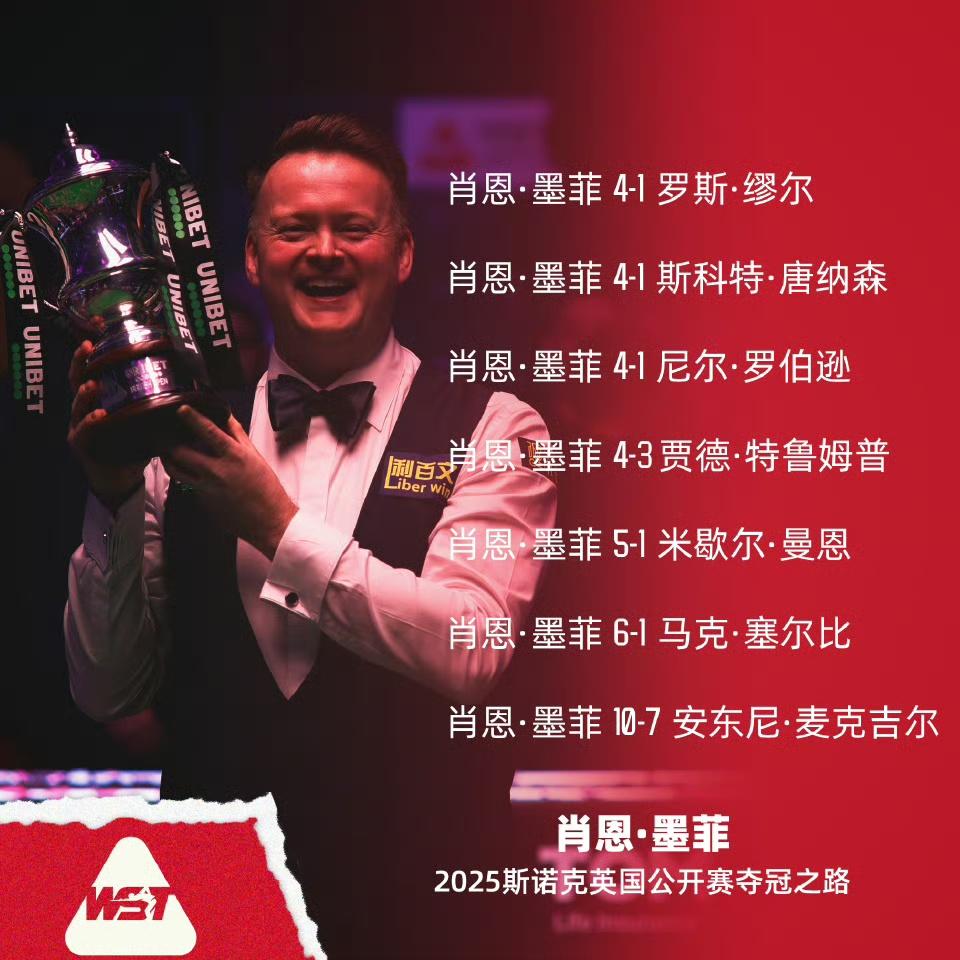 在一场充满悬念的比赛中,双方共打出四杆破百和十杆60分以上的单杆高分,墨菲在最后四局比赛中火力全开。这位43岁的英国选手获得了克莱夫-埃弗顿奖杯(CliveEvertonTrophy)和10万英镑的冠军奖金,这是他自2023年冠军联赛以来获得的首个排名赛冠军。