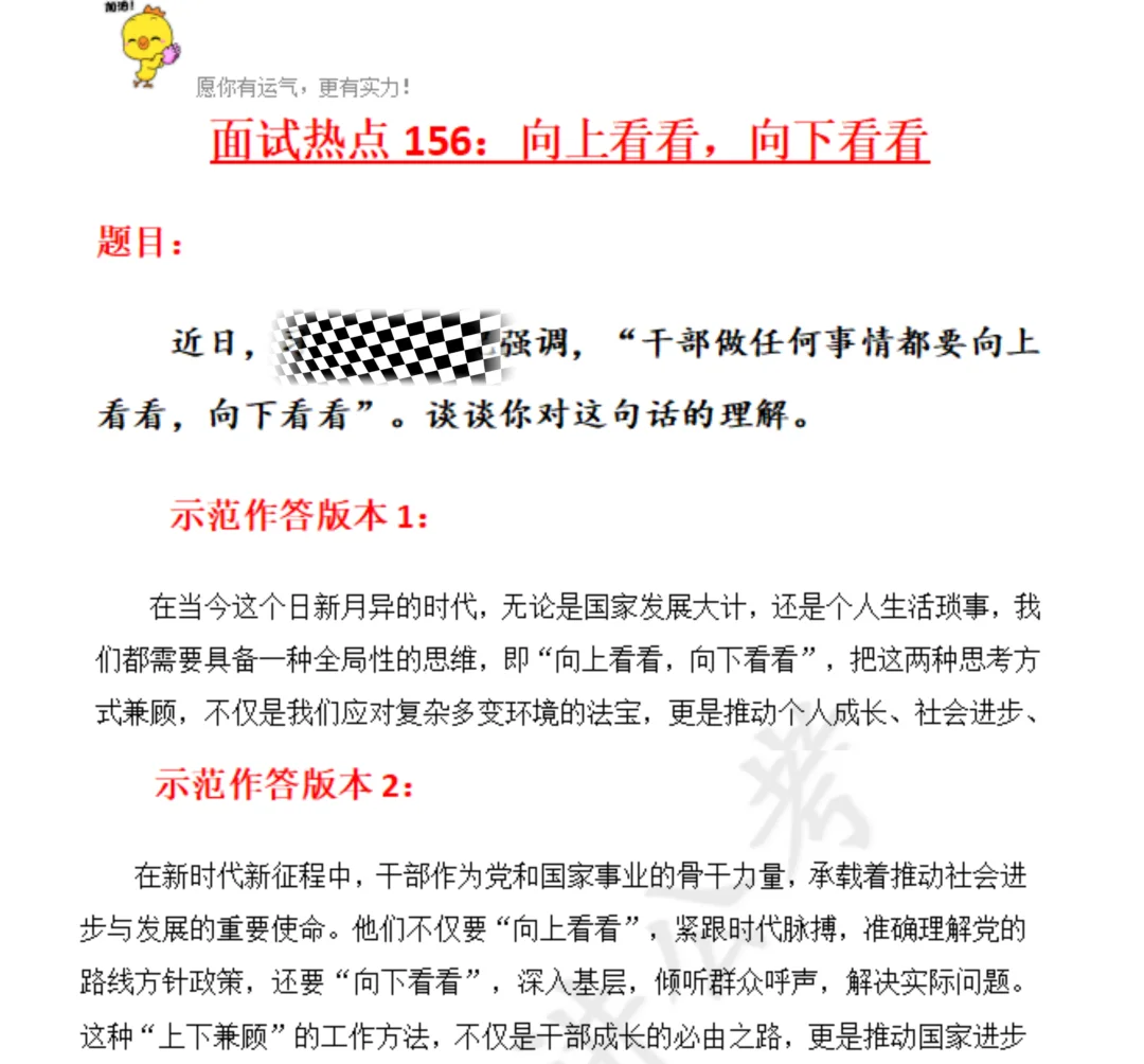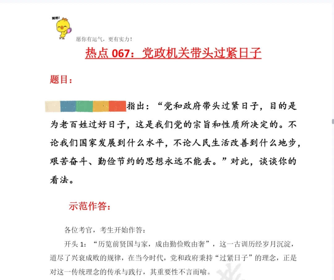❤第一题:政府过紧日子。 就光2025年,各个地方大大小小的考试,都已经考过10+次不止了,是个“老演员”了,接下来,一定还会有地方继续考。 ❤第二题:向上看看向下看看。 2024年考的比较多,25年目前为止,应该只考过2次,也是一个很能发挥能力的题目,所以在逐字稿,给大家准备了两个版本的作答,储备更多,发挥就会更多。
