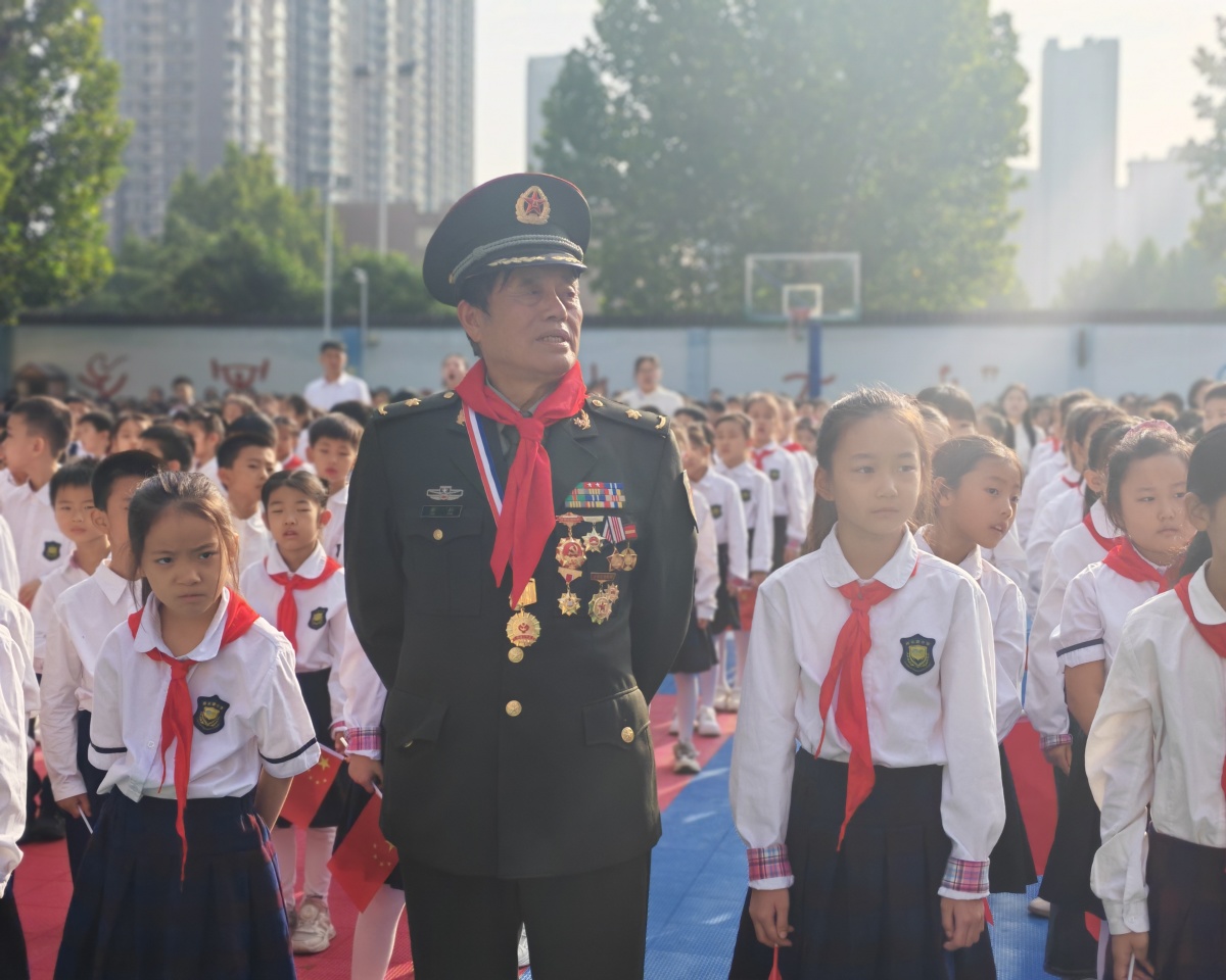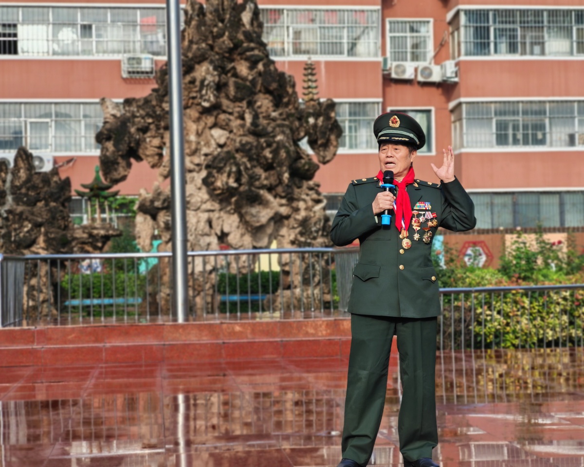 “同学们知道吗?1949年10月1日,毛主席在天安门城楼上宣告新中国成立时,全国人民都在欢呼!”仪式中,最让人动容的当属“国旗下的思政课”环节。学校特意邀请原防空兵指挥学院教授、校外辅导员蔡耘老师开讲,这位曾参加对越自卫还击作战、立下战功的老战士,用自己的亲身经历作“教材”,带领师生重温祖国的奋斗历程。