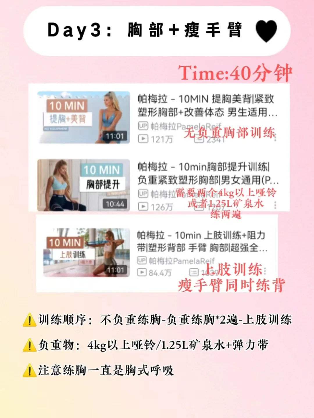 帕姐10分钟提胸美背(无负重)+帕姐10分钟🐻部提升*2遍(这个需要用2个1.25L矿泉水)