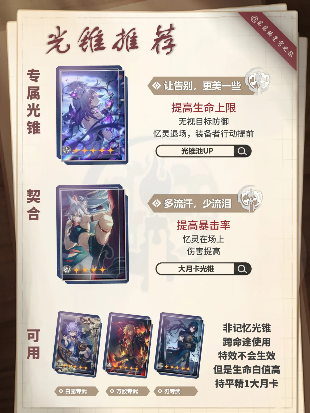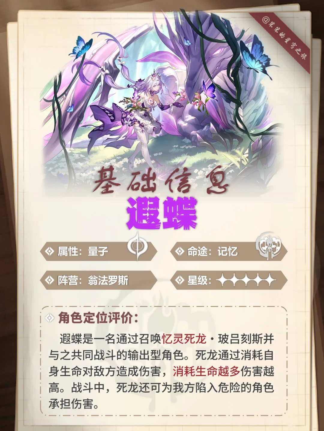 🐱大家好,我是笨笨的铲屎官 今天给大家带来的是遐蝶的培养攻略 遐蝶作为版本大C 推荐抽取0+1或者2+1 记忆命途能用的光锥太少 除了专武,下位就是大月卡武器 其他武器几乎不能用 所以你打算给遐蝶抽几+几?