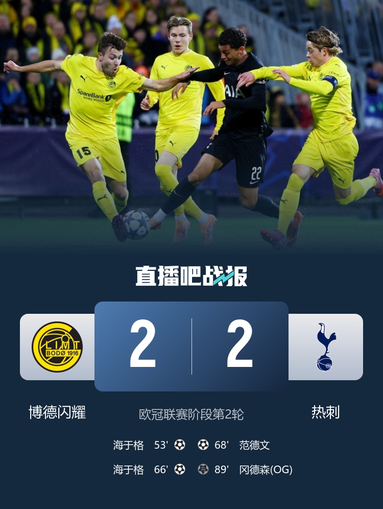 直播吧10月1日讯欧冠联赛阶段第2轮,博德闪耀坐镇主场阿斯米拉体育场迎战热刺。上半场,霍格点球踢飞。易边再战,海于格个人秀双响,范德文破门,本坦库尔进球被吹,热刺造乌龙绝平。最终博德闪耀2-2热刺。积分榜方面,热刺2轮4分,博德闪耀2轮2分。