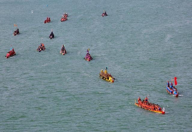 9月24日,广西融水苗族自治县的融江河面上,龙舟队伍在角逐,喜迎国庆中秋佳节。新华社龙林智摄