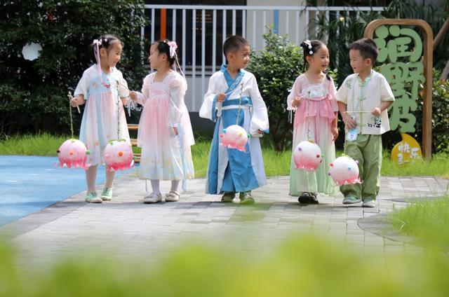 9月25日,江苏省苏州市姑苏区平润实验幼儿园,小朋友提着自制中秋花灯欢乐游园。新华社杭兴微摄