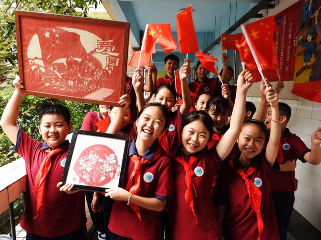 9月26日,四川省达州市开江县西城小学,小学生展示制作的“祝福祖国”创意剪纸作品。新华社邓良奎摄