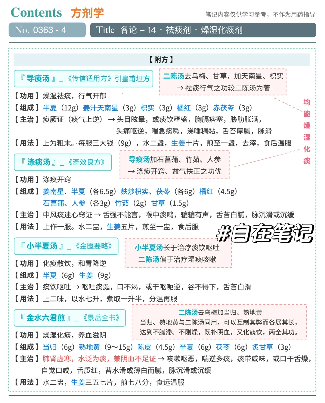 [向右R]新章节,祛痰剂,开始啦~开篇就是名方:二陈汤 🍀🍀🍀二陈汤《太平惠民和剂局方》🍀🍀🍀 【功用】燥湿化痰,理气和中 【证】湿痰证 【症】咳嗽痰多,色白易咯,恶心呕吐,胸膈痞闷,肢体困重,或头眩心悸,舌苔白滑或腻,脉滑 【病机】脾虚湿聚,痰浊阻滞 【现代应用】慢性支气管yan、慢性胃yan、梅尼埃病、神经性呕吐等属湿痰者 【君药】半夏➡️燥湿化痰|降逆和胃 【臣药】陈皮➡️燥湿化痰|理气行滞(原方用橘红,即陈皮去白) 【佐药】茯苓➡️健脾渗湿 【佐药】生姜➡️降逆和胃|温化痰饮 【佐药】乌梅➡️收敛肺气 【佐使】炙甘草➡️健脾和中|调和诸药 【特点】“治痰先治气”;主以燥湿化痰,兼理气健脾利湿,祛痰方的基本结构;散收相合 【方歌】二陈汤用半夏陈,益以茯苓甘草成,利气调中兼去湿,一切痰饮此方珍 【趣味记忆】陈夏领草莓酱 【辨证要点】咳嗽,呕恶,痰多色白易咯,舌苔白腻,脉滑 【禁忌】阴虚燥咳,痰中带血忌用;燥痰慎用 🪴🪴🪴附方 - 导痰汤《传信适用方》🪴🪴🪴 【功用】燥湿祛痰,行气开郁 【主治】痰厥证 → 头目眩晕,或痰饮壅盛,胸膈痞塞,胁肋胀满,头痛呕逆,喘急痰嗽,涕唾稠黏,舌苔厚腻,脉滑 【特点】二陈汤去乌梅、甘草,加天南星、枳实→ 祛痰行气之功较二陈汤为著 🪴🪴🪴附方 - 涤痰汤《奇效良方》🪴🪴🪴 【功用】涤痰开窍 【主治】中风痰迷心窍证→ 舌强不能言,喉中痰鸣,辘辘有声,舌苔白腻,脉沉滑或沉缓 【特点】导痰汤加石菖蒲、竹茹、人参→ 涤痰开窍、益气扶正之功优 🪴🪴🪴附方 - 小半夏汤《金匮要略》🪴🪴🪴 【功用】化痰散饮,和胃降逆 【主治】痰饮呕吐 → 呕吐痰涎,口不渴,或干呕呃逆,谷不得下,舌苔白滑 【特点】小半夏汤长于治痰饮呕吐;二陈汤偏于治湿痰咳嗽 🪴🪴🪴附方 - 金水六君煎《景岳全书》🪴🪴🪴 【功用】燥湿化痰,养血滋阴 【主治】肺肾虚寒,水泛为痰,兼阴血不足证 【特点】二陈汤去乌梅加当归、熟地黄。归地与二陈汤同用,可互制其弊而各展其长,达到不腻滞、不刚燥,既补阴血又化痰饮,两全其功