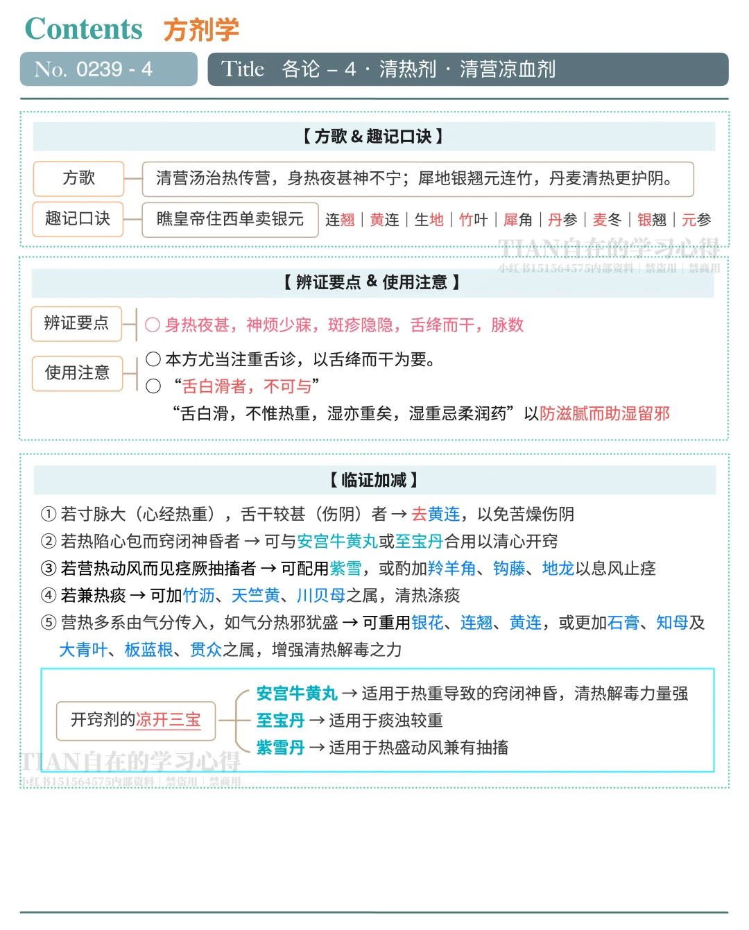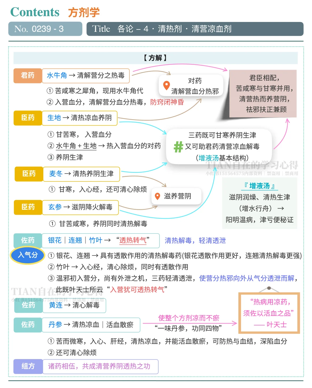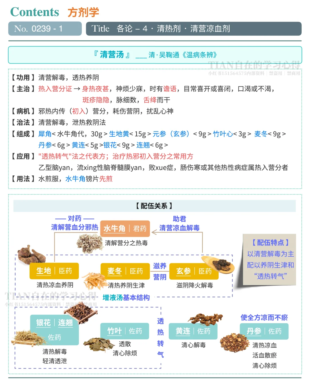 【 方歌 】清营汤治热传营,身热夜甚神不宁;犀地银翘元连竹,丹麦清热更护阴