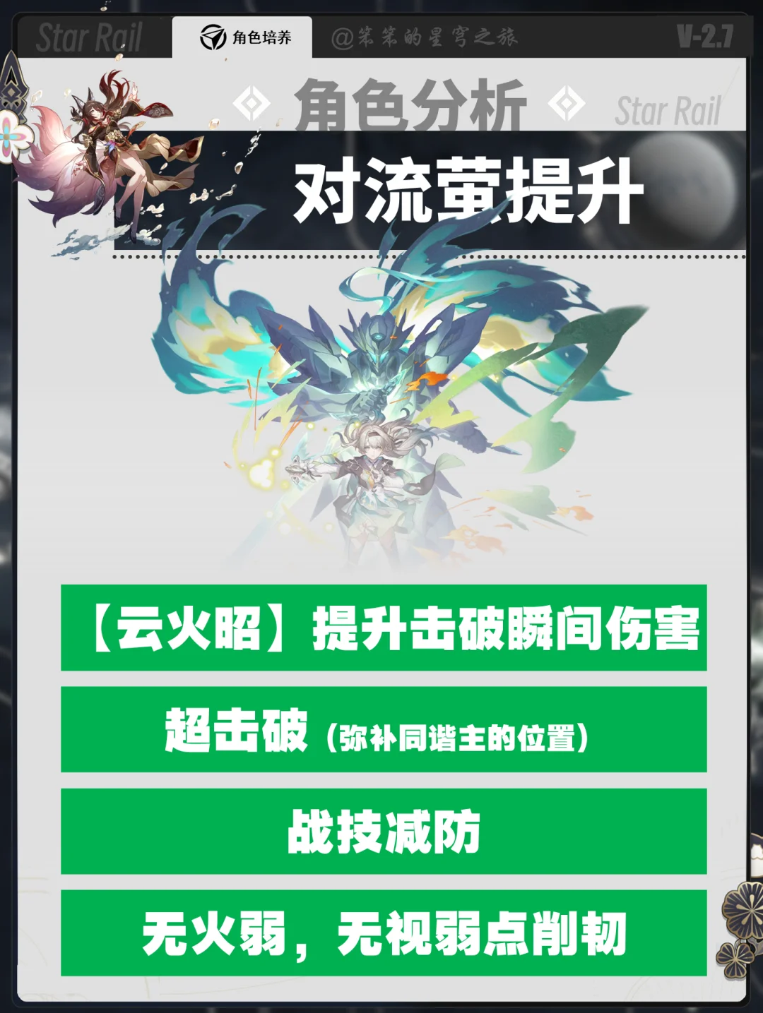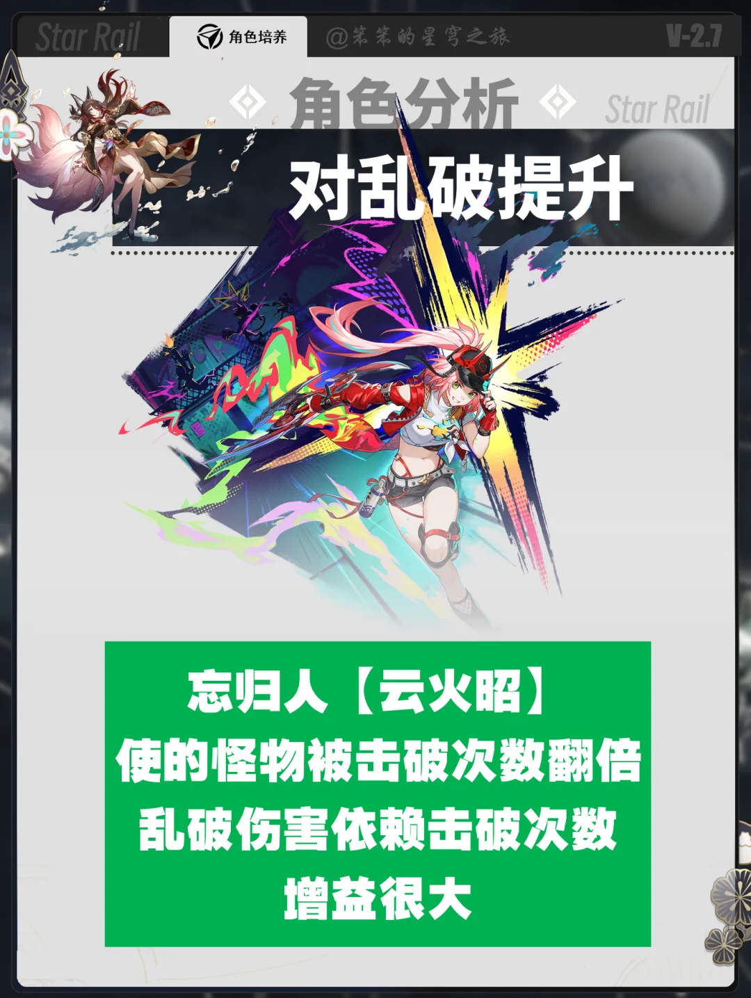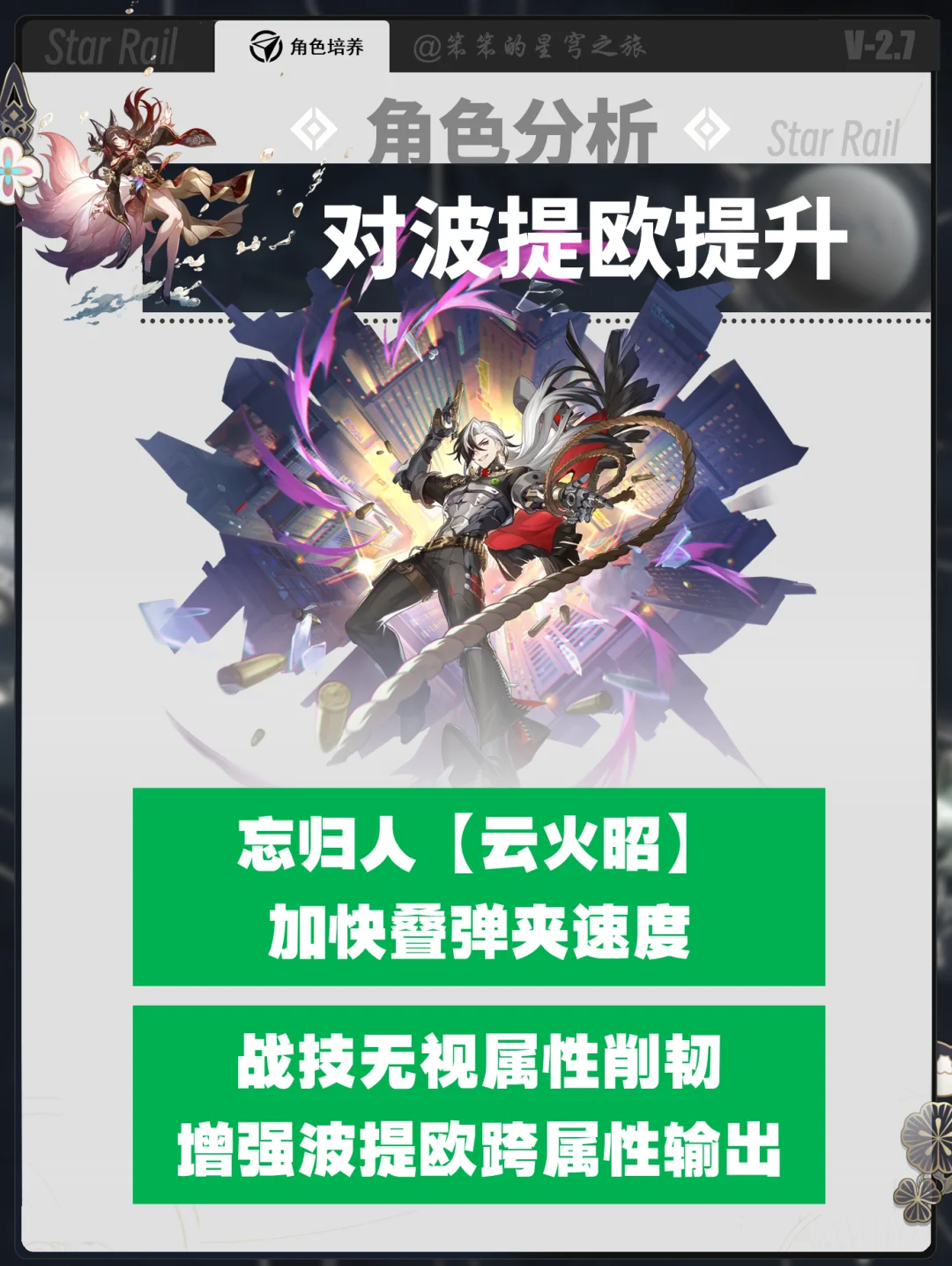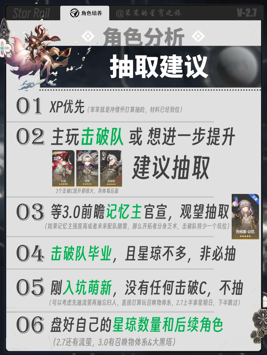 🐱大家好,我是笨笨的铲屎官 忘归人创作体验服开测了 笨笨第一时间带大家带来的抽取攻略 ①忘归人对于击破队提升很大 三大击破C:流萤、乱破、波提欧都有提升 ②忘归人说替换同谐主的位置的 如果没有阮梅,也可以和同谐主一起进入击破队 ③毕竟3.0会进入新的体系队伍 而且同谐主也会开启记忆主 大家可以考虑抽个00忘归人
