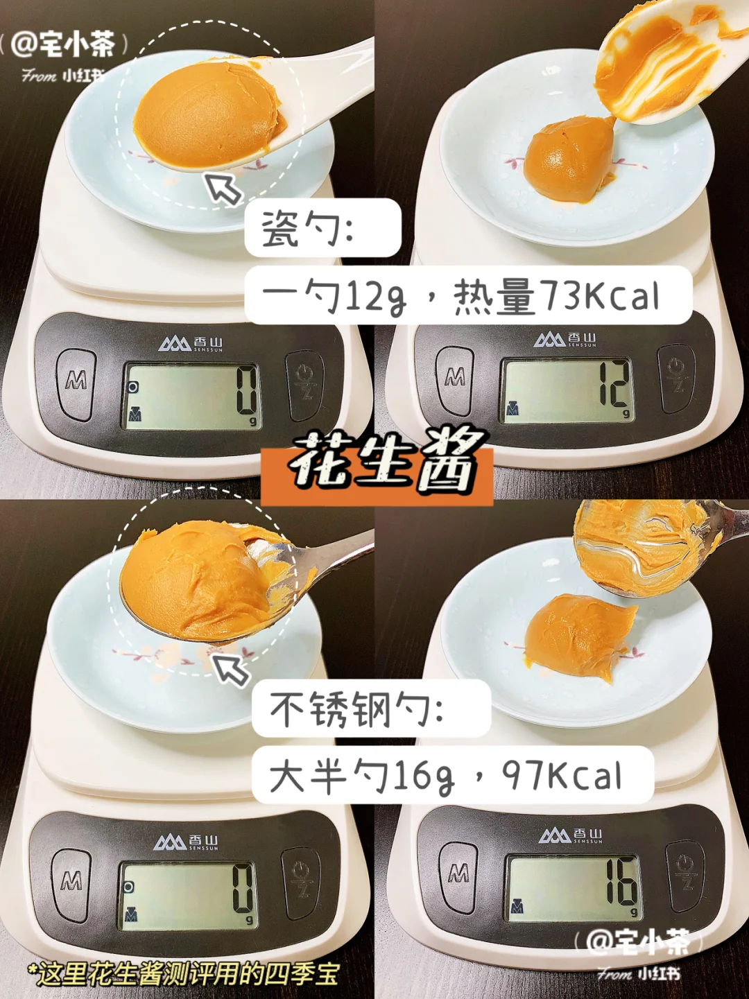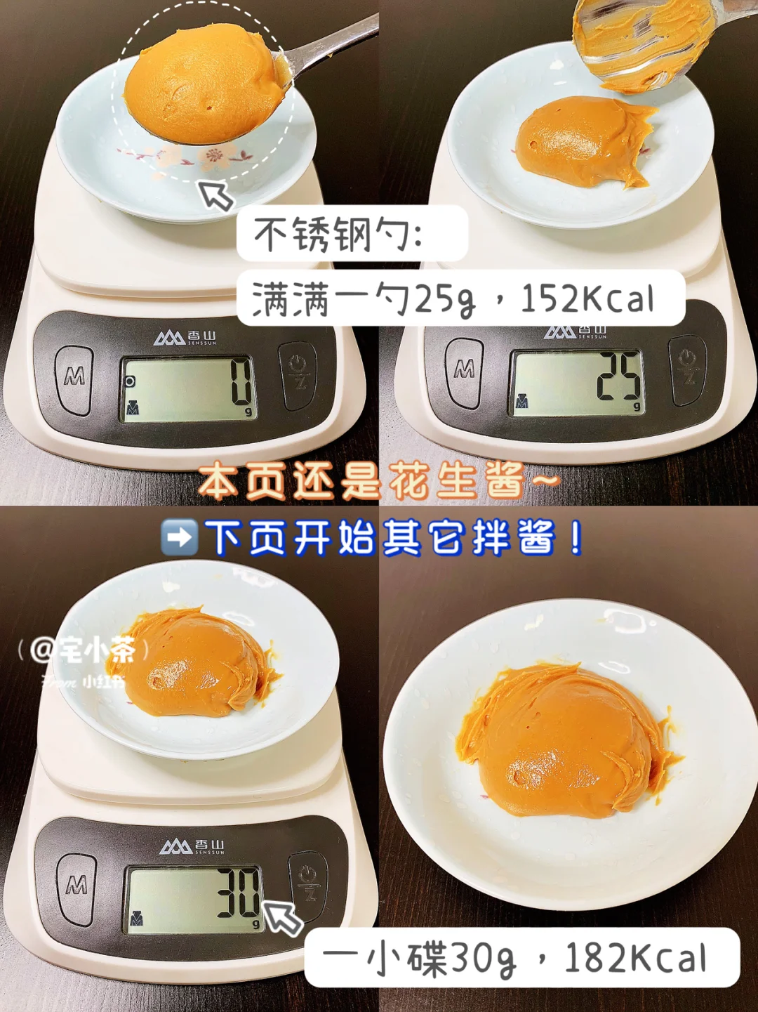 👉其中花生酱🥜很多集美说把握不好量,我用瓷勺和不锈钢勺分别测了重量+热量,有需要的集美可以收藏起来啦![派对R]