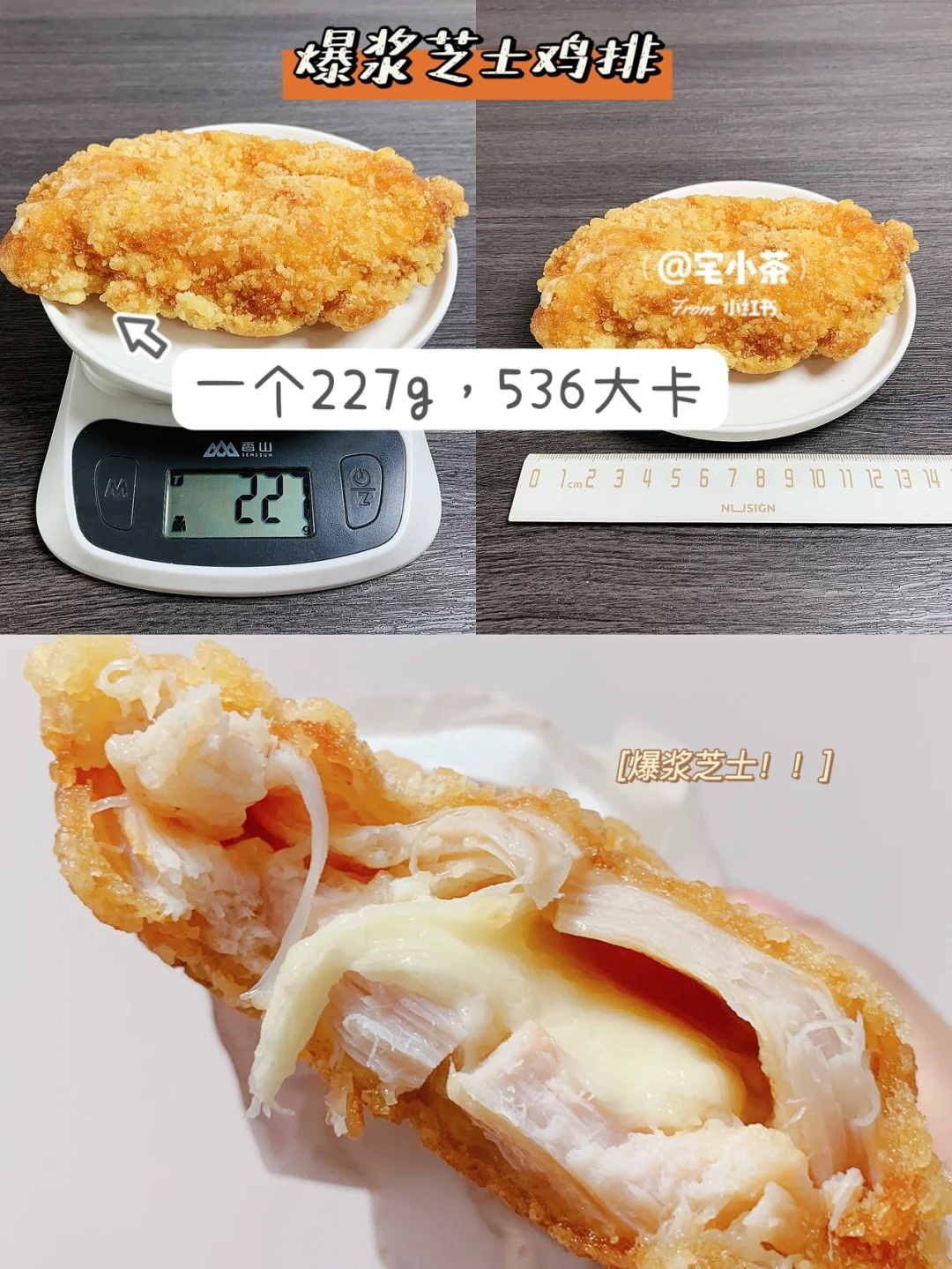 爆浆芝士鸡排:一个227g,热量536大卡