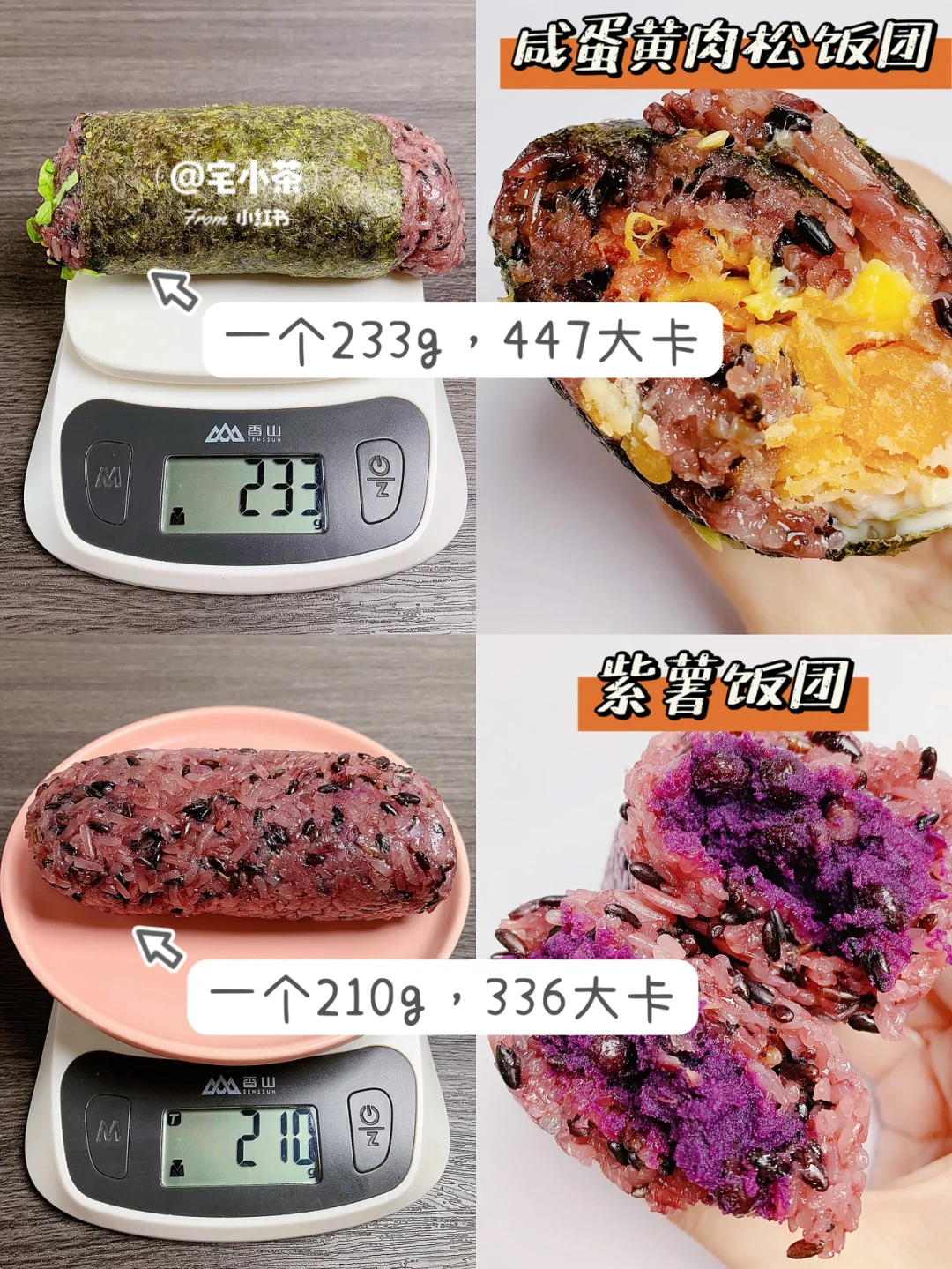 紫薯饭团:一个210g,热量336大卡