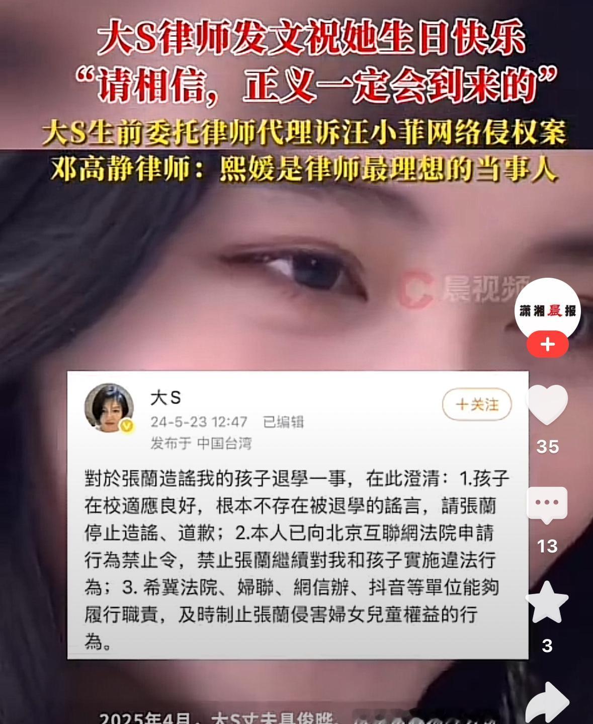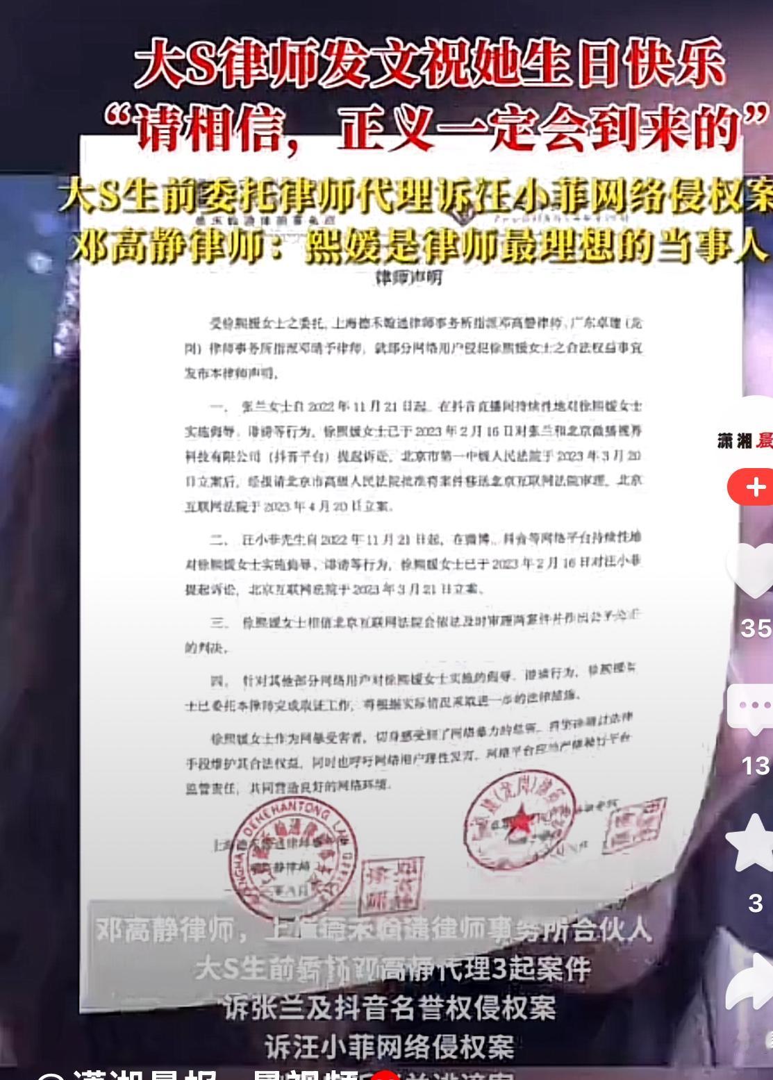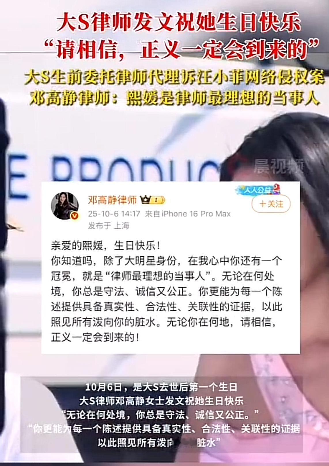 10月6号,大s生日,很多人发文悼念,大s律师,发文祝大s生日快乐,她说“你是律师最理想的当事人,无论在何处境,你总是守法,诚信又公正,你更能为每个陈述提供具备真实性,合法性,关联性的证据,以此照见泼向你的脏水,无论你在何地,请相信,正义一定会到来的”。 能看出,她的律师跟她已经非常有感情,也许对她的遭遇充满了同情,因为她了解整个事件。 当然了,我们并不了解真相,但是,我们真的希望正义不会缺席,不要放过一个坏人,也不要委屈一个好人。