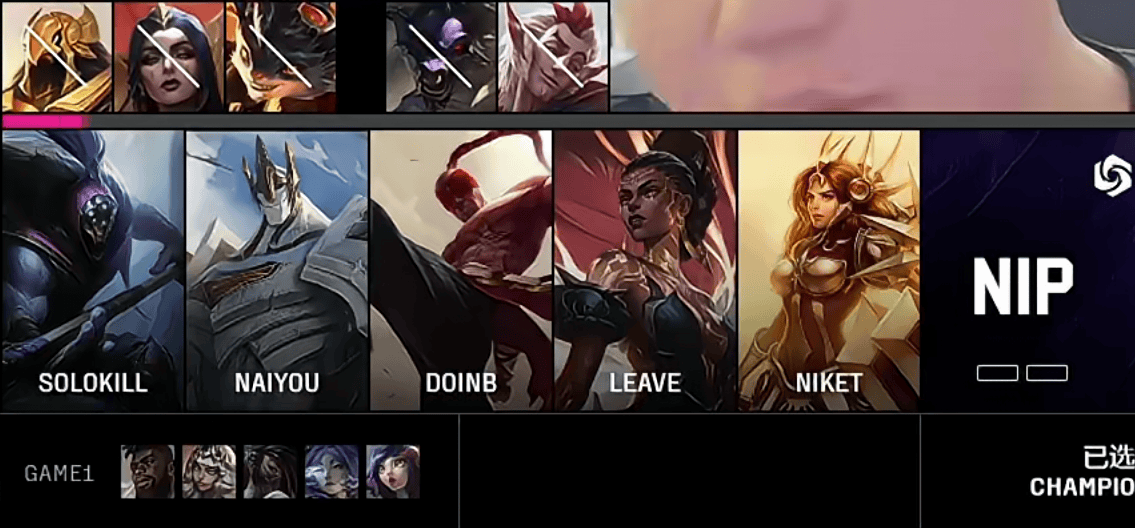 NIP选用:Solokill贾克斯、naiyou盲僧、Doinb加里奥、Leave梅尔、Niket蕾欧娜