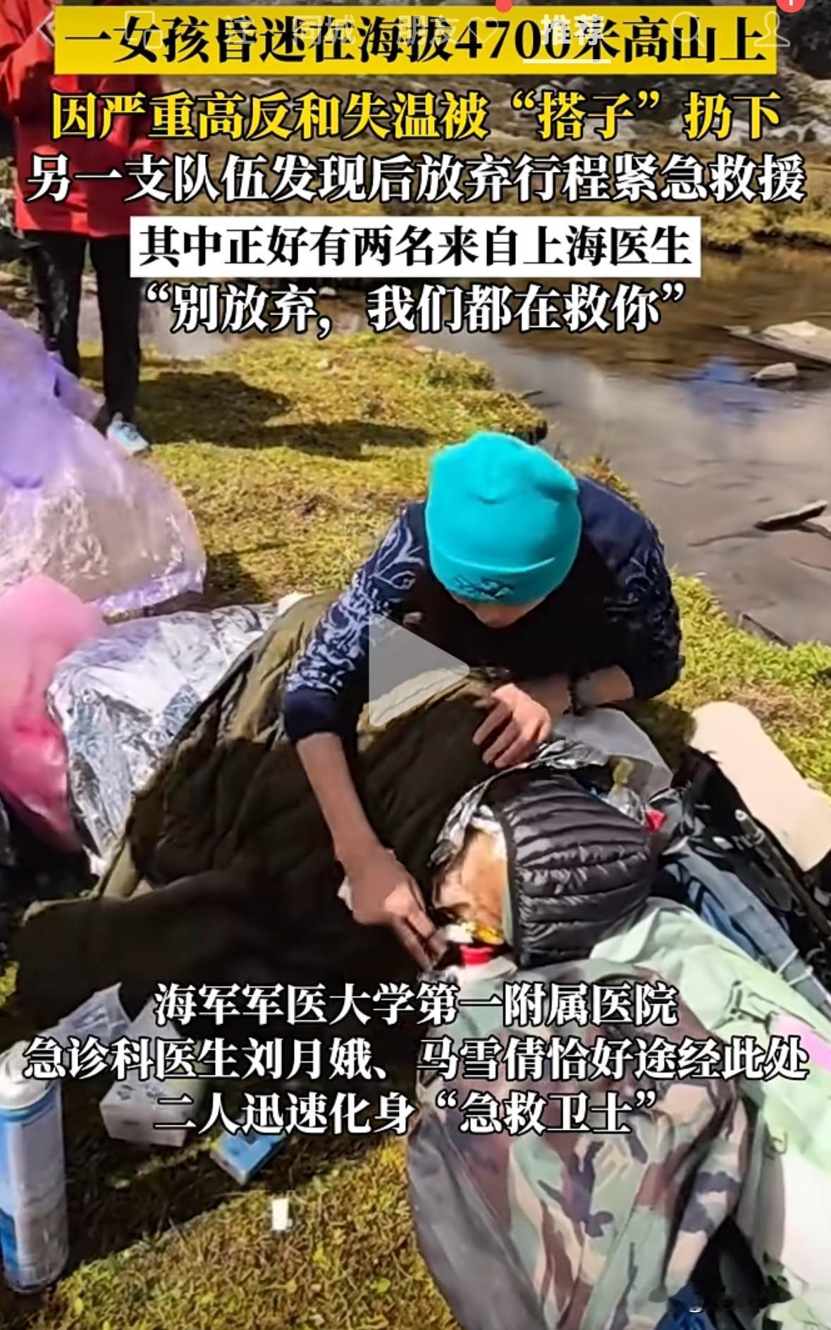 女孩儿在4700米海拔高度上,因为严重高反,被同行“搭子”抛下,被另外一支队伍发现。这些人没有放弃女孩儿,一直告诉她,别睡,我们在救你,之后背着女孩儿下山,这支徒步队伍里有两位医生,关键时刻,我们感受到了医生的责任心和职业素养已经人品。 我很不理解那些一说医生好,就在评论区大骂的那些人,你们有病不去医院么?关键时刻,不是医生再救死扶伤么?那么多的不理解和恨意,真不知道哪里来的。 我这次去南宁手术,没有一个医生要红包,更没有医生难为病人,她们尽可能的满足病人的要求。看到为我手术的医生,不停的做手术,下班了还在医院随访病人家属实际她们就算不做到这样尽职尽责,工资也一样那么多。 这个女孩也一样,如果不是遇到后来这支队伍,没有遇到两位医生,她的生命也许就停留在海拔4700的高度。 这个世界上一点不缺少能打动我们的事,爱需要传递,需要弘扬,更需要认可和鼓励。