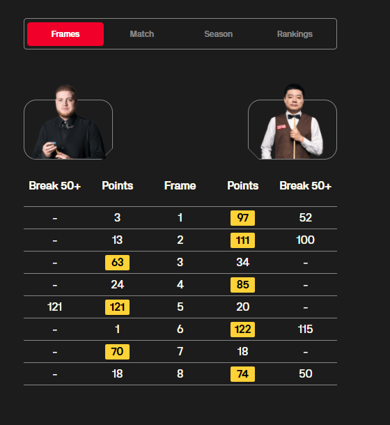 全场比赛,丁俊晖打出两杆破百(115、100)和两杆50+(52、50分);希斯科特打出一杆破百(121)。