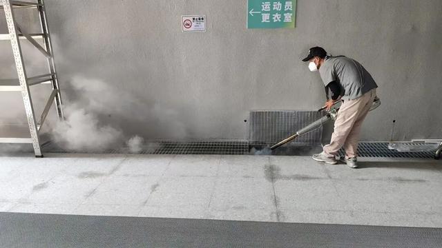 记者在云浮市曲棍球场看到,专业消杀团队正按照“分时分区、精准施治”原则,对看台缝隙、球员通道、裁判休息室等密闭区域,实施长效滞留喷洒,药剂选用符合国家环保标准的高效氯氰菊酯制剂,可在物体表面形成持续防护层。针对场馆外围绿化带、排水渠等蚊虫高频栖息区,消杀人员则启用热烟机进行空间喷洒,借助烟雾渗透力对隐蔽角落进行全域覆盖。