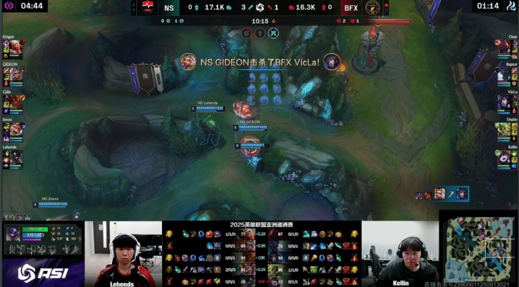 [10:15]Lehends牛头下路野区拍晕Vicla狐狸,NS三人到位将其击杀,NS经济领先1k。