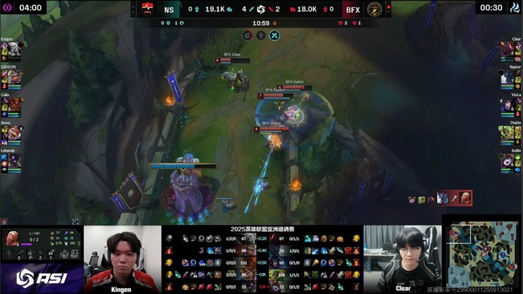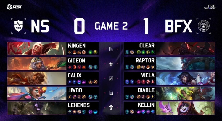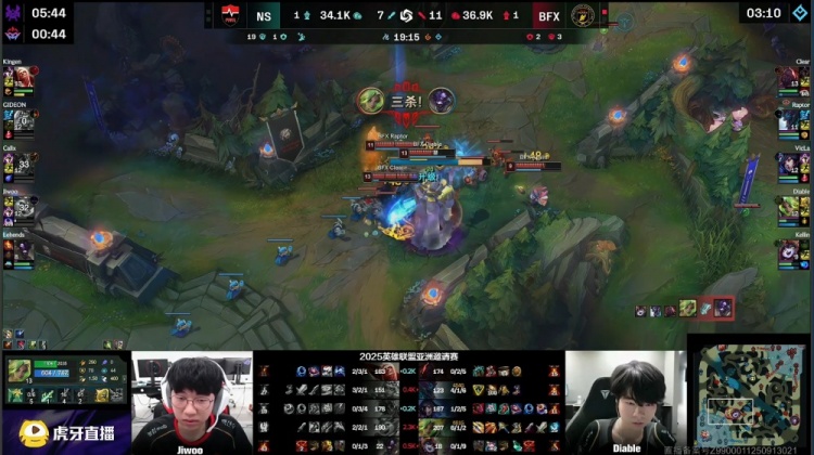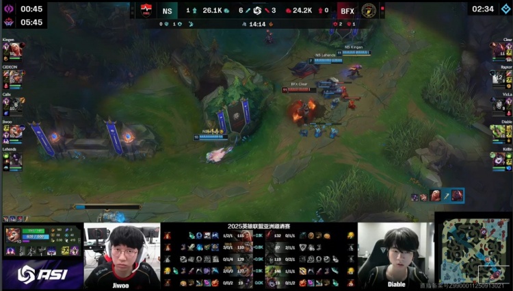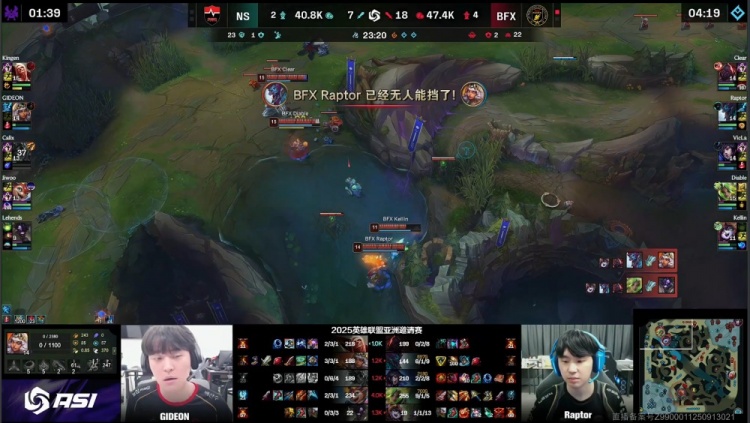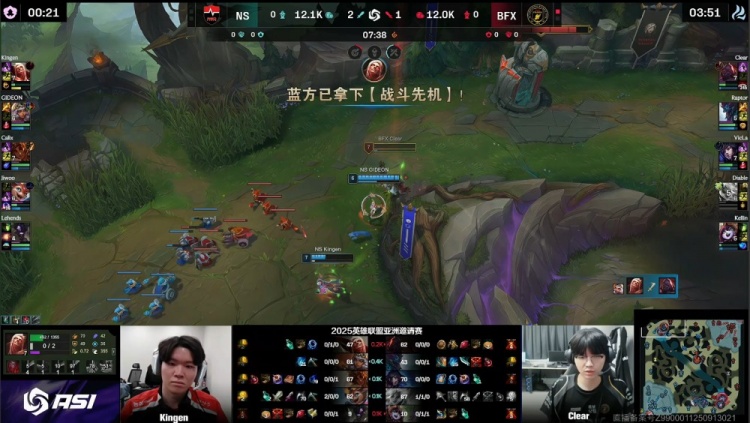 [7:25]BFX下路四包一越塔,Diable泽丽抗塔被Jiwoo斯莫德单杀,GIDEON同时去上配合Kingen吸血鬼击杀Clear赛恩,NS打出0换2,双方经济差距不大。