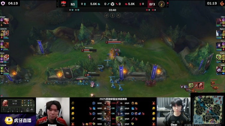 [13:45]下路混战,BFX三人硬杀Calix岩雀得手,但Vicla与Raptor难逃一死,Kingen吸血鬼来下与队友留住Clear赛恩,NS打出1换3,经济领先3k。