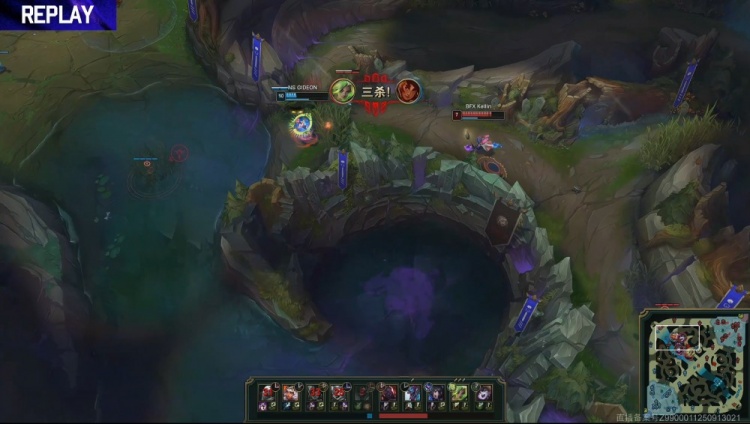 [10:51]BFX四人上路越塔击杀Kingen吸血鬼,kingen又见面就交血池,Diable泽丽拿到人头,GIDEON与Calix推掉BFX下路一塔。