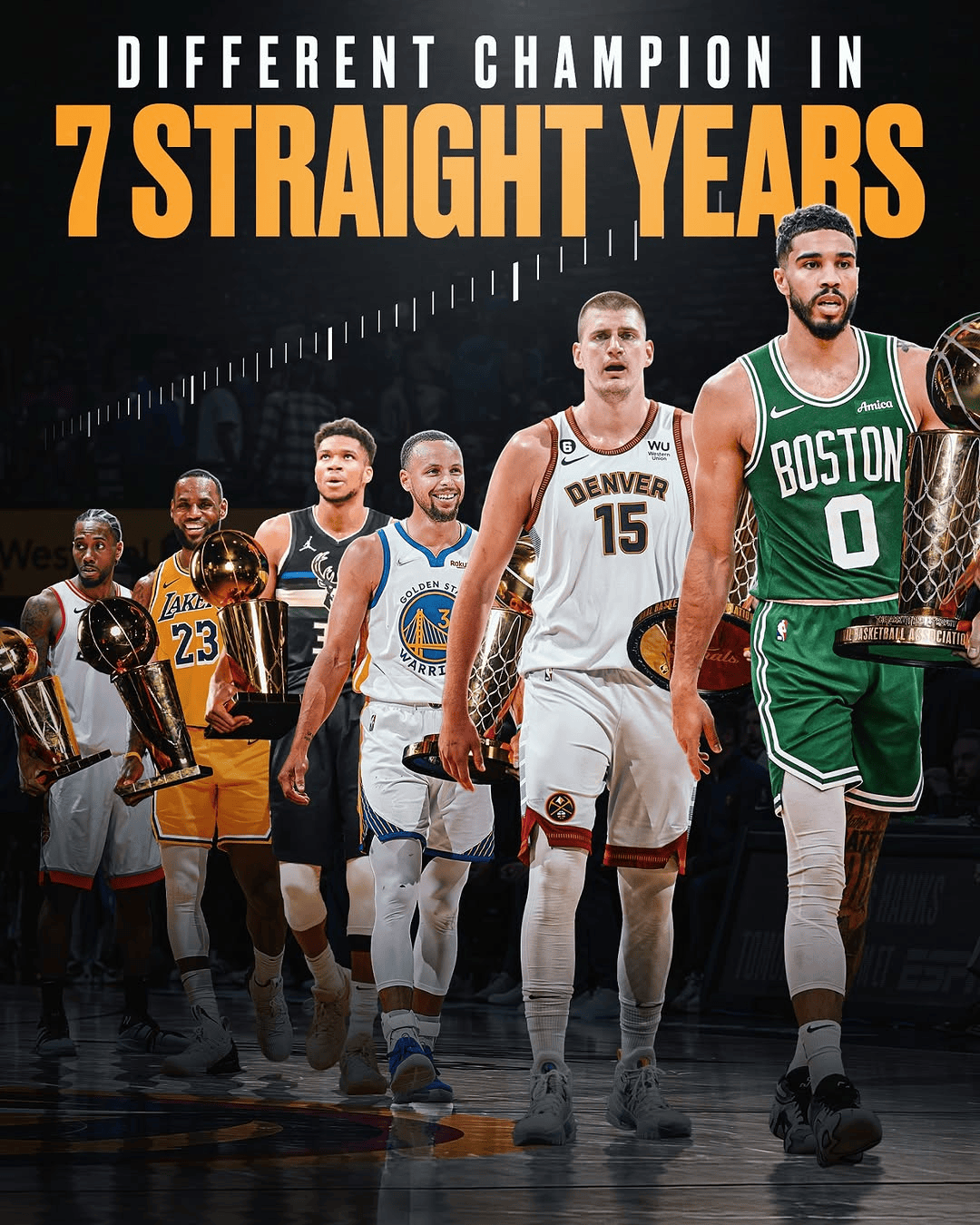 猛龙、湖人、雄鹿、勇士、掘金、凯尔特人、雷霆,回顾过去7年的夺冠球队,几乎没有一支球队是该赛季开始前的夺冠第一热门。