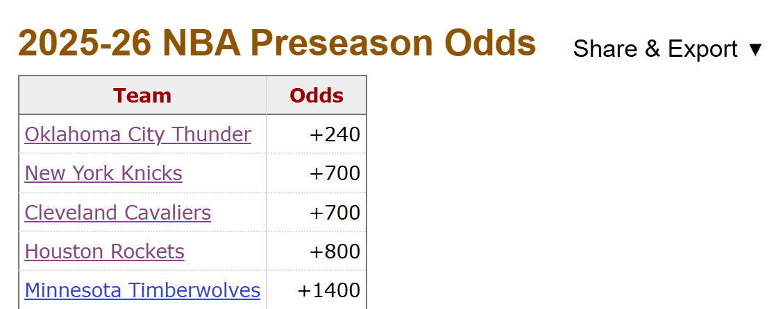 -BasketballReference的夺冠赔率,雷霆以+240一骑绝尘: