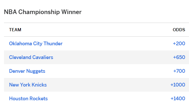 -ESPN的新赛季夺冠赔率,雷霆以+200断层领先: