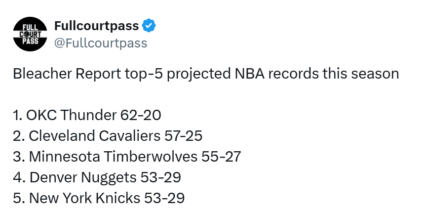 -BR预测的新赛季战绩前五名球队,雷霆62胜20负高居第一: