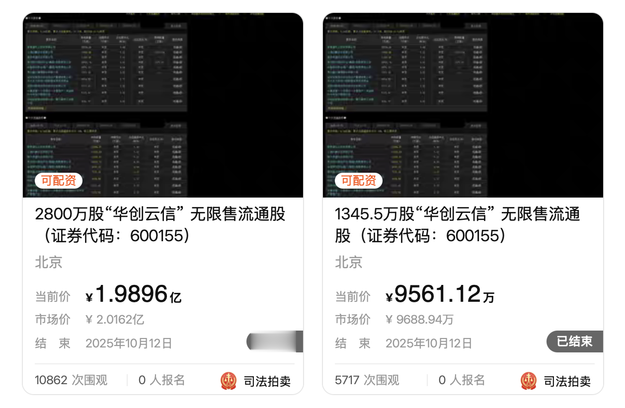 上证报中国证券网讯(刘禹希记者徐蔚)10月12日上午10时,上海杉融实业有限公司(以下简称“杉融实业”)持有的合计4145.5万股华创云信股份在淘宝网司法拍卖平台结束拍卖,因无人出价,两个标的物均告流拍。