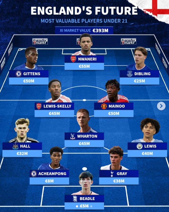 直播吧10月12日讯德转列出英格兰U21最贵阵容,恩瓦内里突前,斯凯利、梅努、吉滕斯在列,全队总身价3.93亿欧。