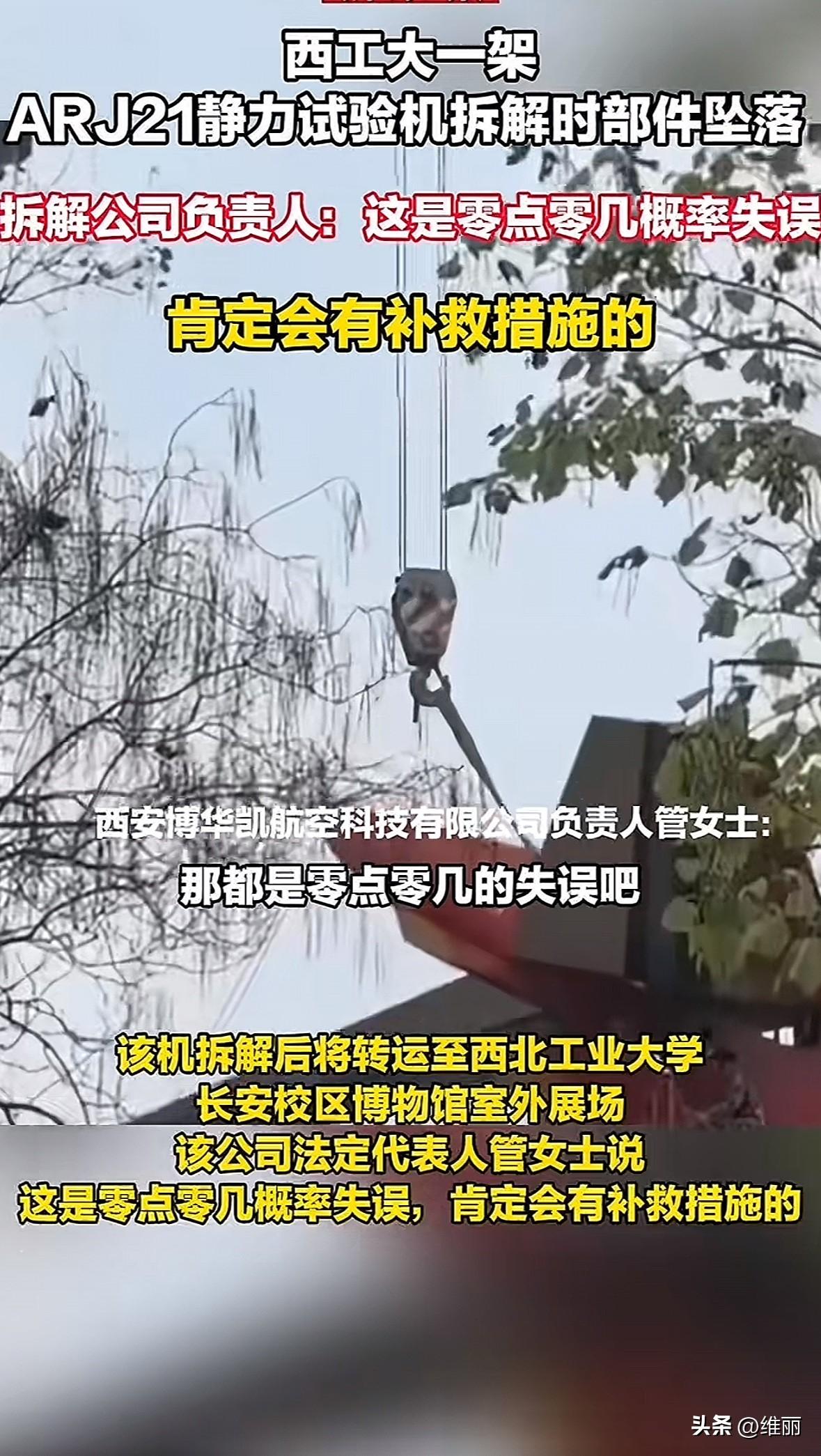 10月13日,西北工业大学长安校区里,一架ARJ21静力试验机拆解时出了状况。尾翼部件从吊车吊绳上滑下来摔在了地上。 这架飞机是中国商飞捐的零号试验机,2011年就停在这儿了,一直用来教学和搞科研。拆解转运是西安博华凯航空科技有限公司负责的。 公司负责人管女士说,这是零点零几概率的失误,肯定会有补救措施。 不少人觉得,再小的概率失误也是失误。航空相关的事容不得半点马虎,哪怕是用于教学的旧试验机,拆解操作也得绷紧安全和规范这根弦。希望后续补救能到位,也给其他相关操作提个醒。