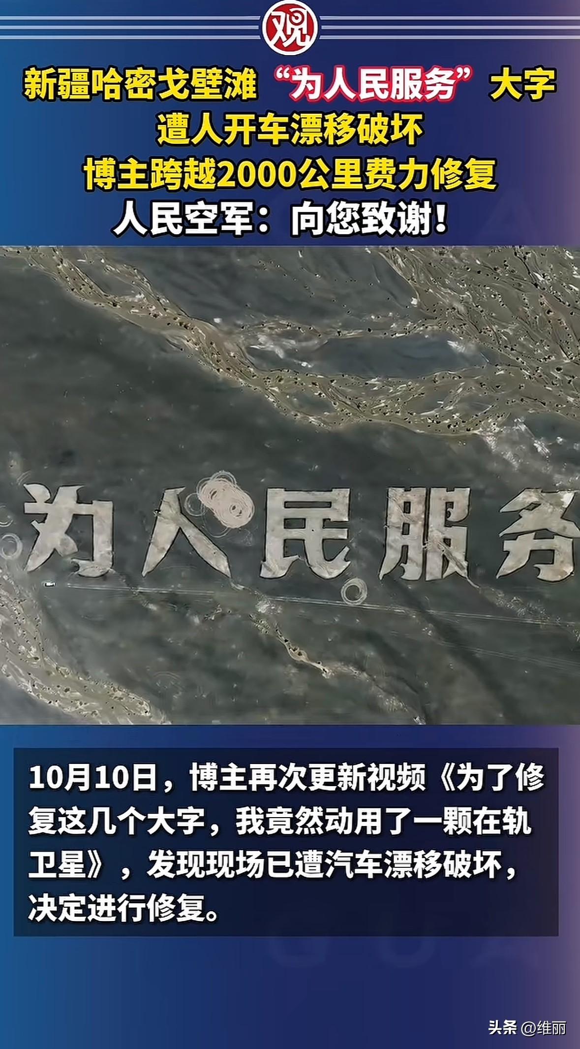 新疆哈密戈壁滩上的“为人民服务”大字,是上世纪60年代航校官兵耗时数月挖出的,每个50米见方,是飞行员的“空中灯塔”。 今年有博主发现,“人民”二字中间被越野车漂移碾出深沟。博主陆遥自掏腰包,找20吨同色砂石,27车运到现场修复,还联系卫星拍下修复画面。 “人民空军”账号为此留言致谢。有叫“新疆平头哥”的博主自曝曾在现场漂移,事后删视频狡辩,账号已被禁言。 这五个字扛住60年风沙,却差点毁在任性撒欢里。破坏的是地标,更是对历史的敬畏。修复的不仅是砂石,还有民族的集体记忆。哈密相关部门已介入调查,这种亵渎历史的行为,必须付出代价。