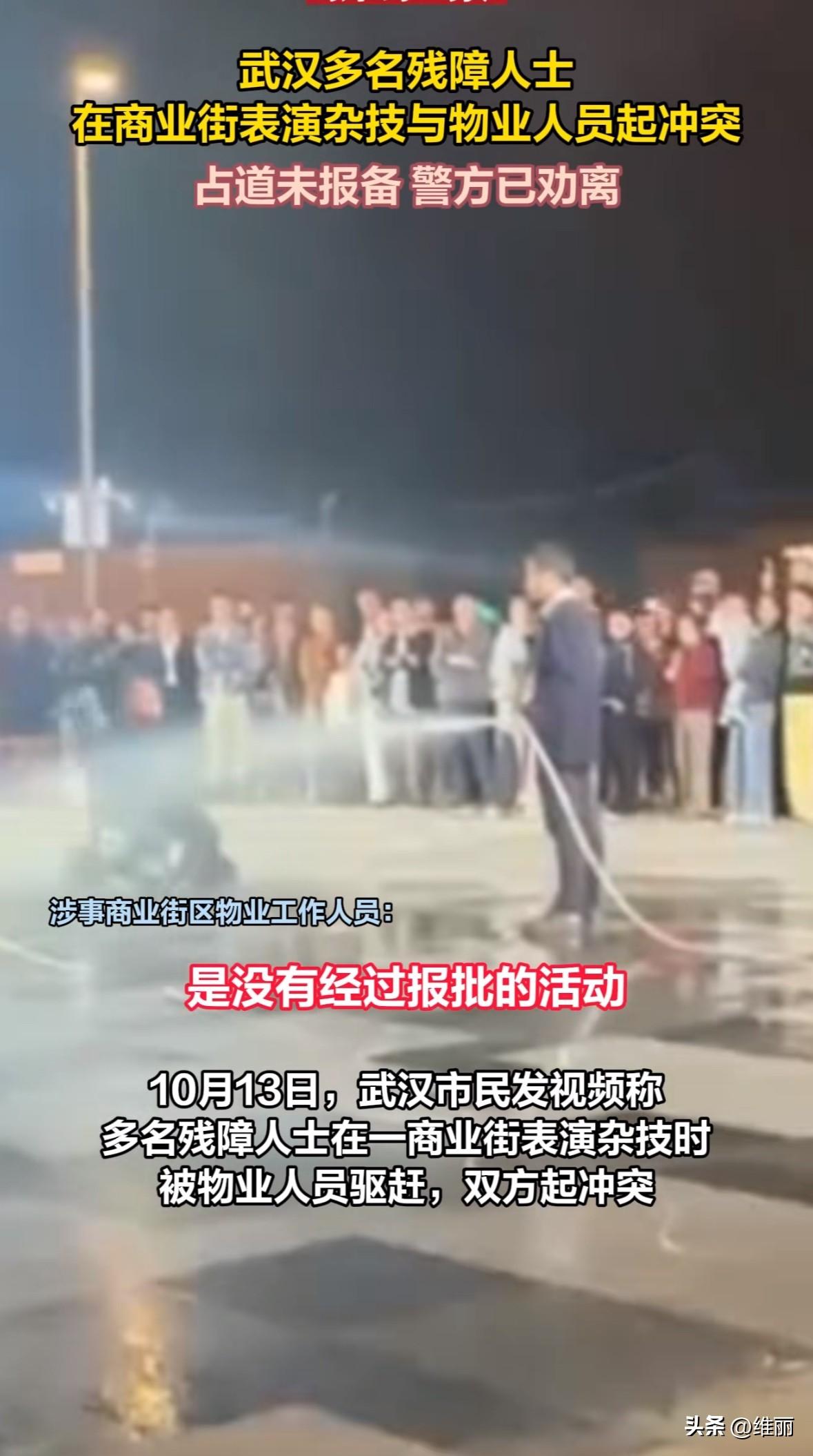 10月13日,武汉有市民发视频,多名残障人士在商业街表演杂技时和物业人员起了冲突。 14号物业说,这些表演人员没报备就占了街道,当时员工在冲地面,就去劝离了。辖区派出所也说了,13号晚上去现场劝了,最后把表演人员劝走了。 街头表演得按规矩来,占道又没报备确实不合适。但残障人士讨生活也不容易,物业要是能先好好沟通,别让矛盾闹起来就更好了。规矩要守,对特殊群体的包容和体谅也不能少。