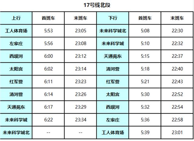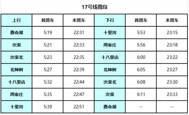 17号线启动贯通按图试运行后,各站首末班车时间也有所调整。17号线南段(嘉会湖站-十里河站)各站,首班车发车时间最多提前12分钟,末班车发车时间最多延后47分钟;17号线北段(工人体育场站-未来科学城北站)各站,首班车发车时间最多提前12分钟,末班车发车时间最多延后8分钟;17号线南段和北段全天运营时间增长。