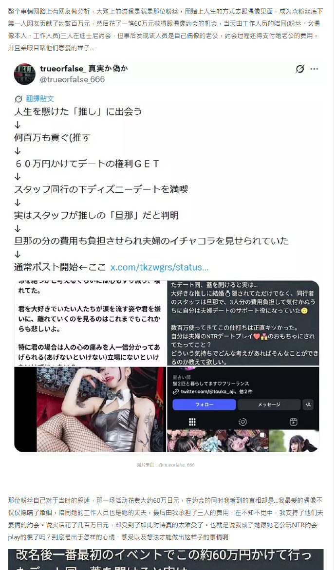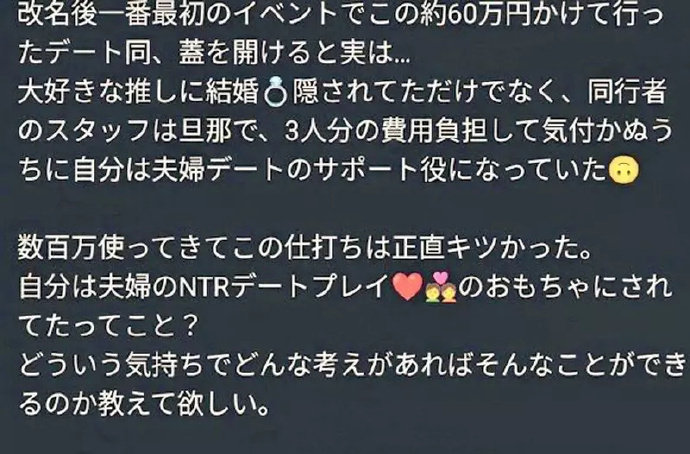 据透露,三人当天总消费额约为60万日元(约2.8万元人民币)。该粉丝表示,自己仿佛成了这对夫妇NTR约会游戏中的一环。