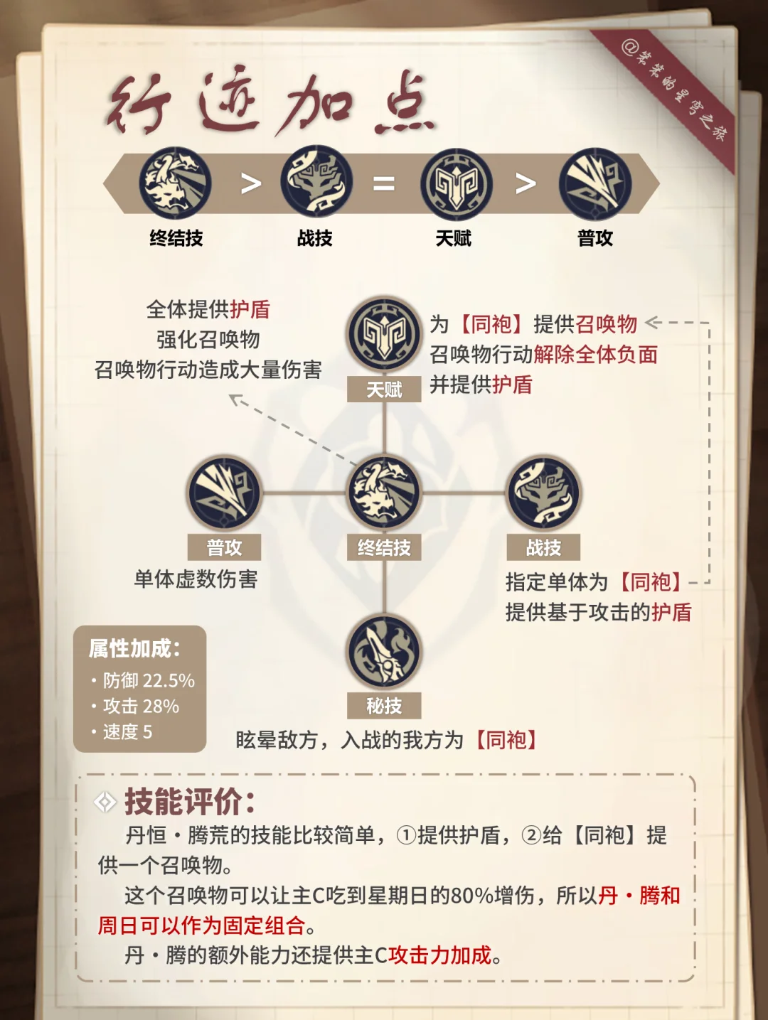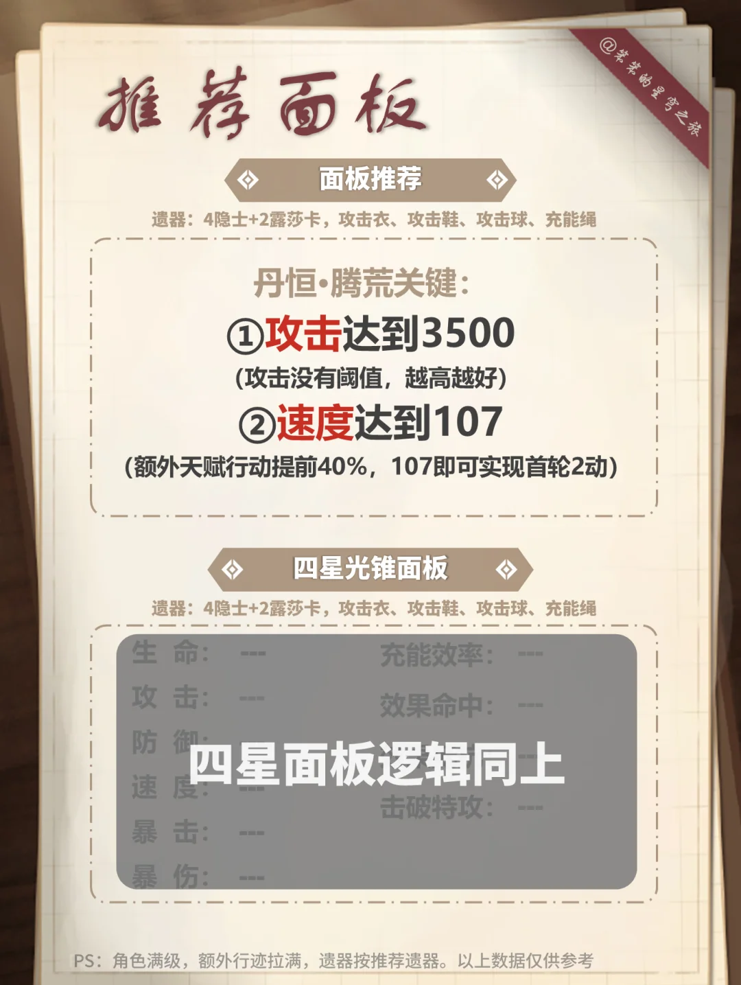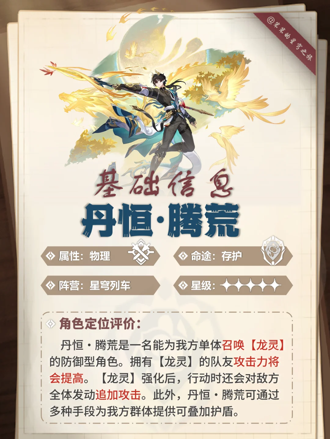 🐱大家好,我是笨笨 今天给大家带来的是丹恒·腾荒的培养攻略 内容来自创作体验服,以正式服为准 今天中午12点就可以白嫖丹恒啦 丹恒·腾荒主要堆攻击力 这是和以往的存护不同的 所以除了专武外,并没有其他十分其他的光锥 建议优先专武,其次一魂 不抽专武也可以用其他高攻击力的武器 遗器外圈新的护盾套,内圈露莎卡 主词条攻击衣、速度/攻击鞋 攻击球,充能>攻击绳 各位开拓者们都提前准备好了吗