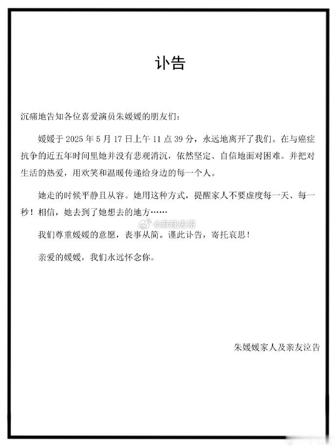 辛柏青发了讣告,说自己老婆朱媛媛去世