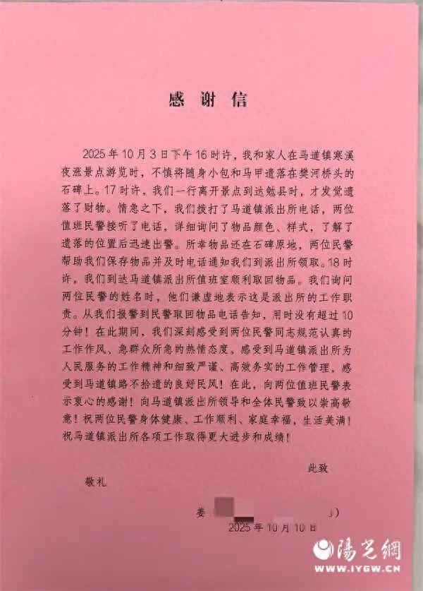 阳光讯(王思梦记者李希)10月16日,留坝县公安局马道派出所收到了来自姜女士快递邮寄来的感谢信,信中写道“我们询问两位民警的姓名时,他们谦虚地表示这是派出所的工作职责......”群众利益无小事,为民服暖民心。留坝县公安局马道派出所以实际行动诠释着公安民警的责任和担当,以真情服务温暖民心。