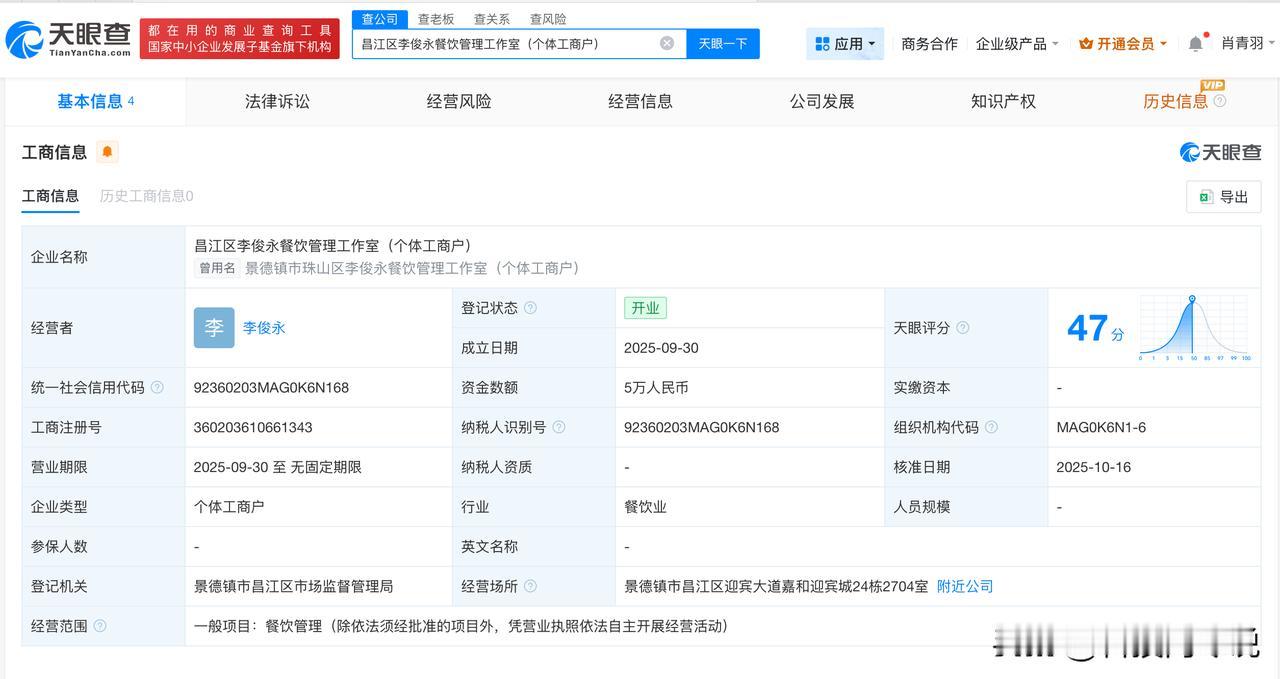 【鸡排哥变更工作室经营地址 鸡排哥工作室发生工商变更】 天眼查App显示,近日,景德镇市珠山区李俊永餐饮管理工作室(个体工商户)发生工商变更,企业名称变更为昌江区李俊永餐饮管理工作室(个体工商户),经营范围去除食品销售(仅销售预包装食品),同时经营地址也发生变更。 该工作室成立于今年9月,为个体工商户,经营者为李俊永(鸡排哥),资金数额5万人民币。 天眼查信息: