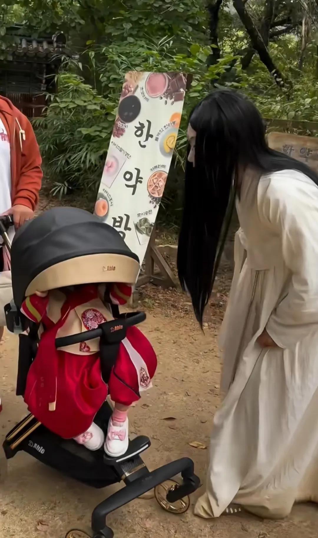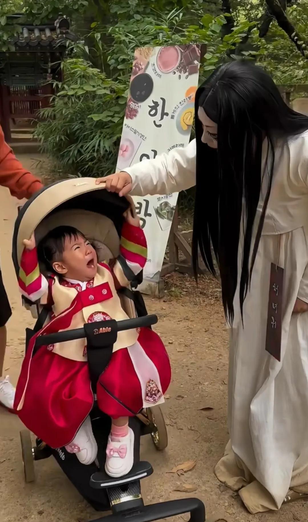 网友:带宝宝出门游玩,偶遇一位古装“神秘人”。宝宝被吓得哇哇大哭,小手紧紧抓住推车!